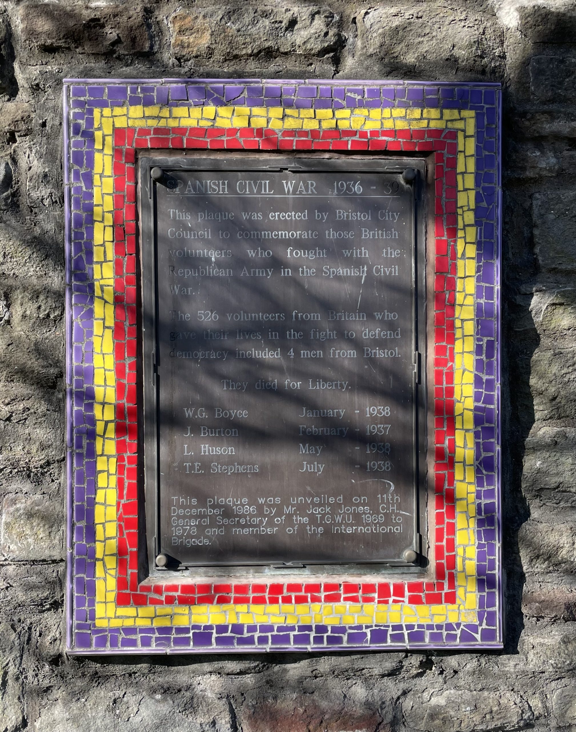 The plaque’s wording reads: “This plaque was erected by Bristol City Council to commemorate those British volunteers who fought with the Republican Army in the Spanish Civil War.