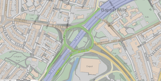 Today, the M32 roundabout cuts Lower Ashley Road in half, creating a division between the areas of St Paul’s and St Werburgh’s and Easton – image: Bristol City Council