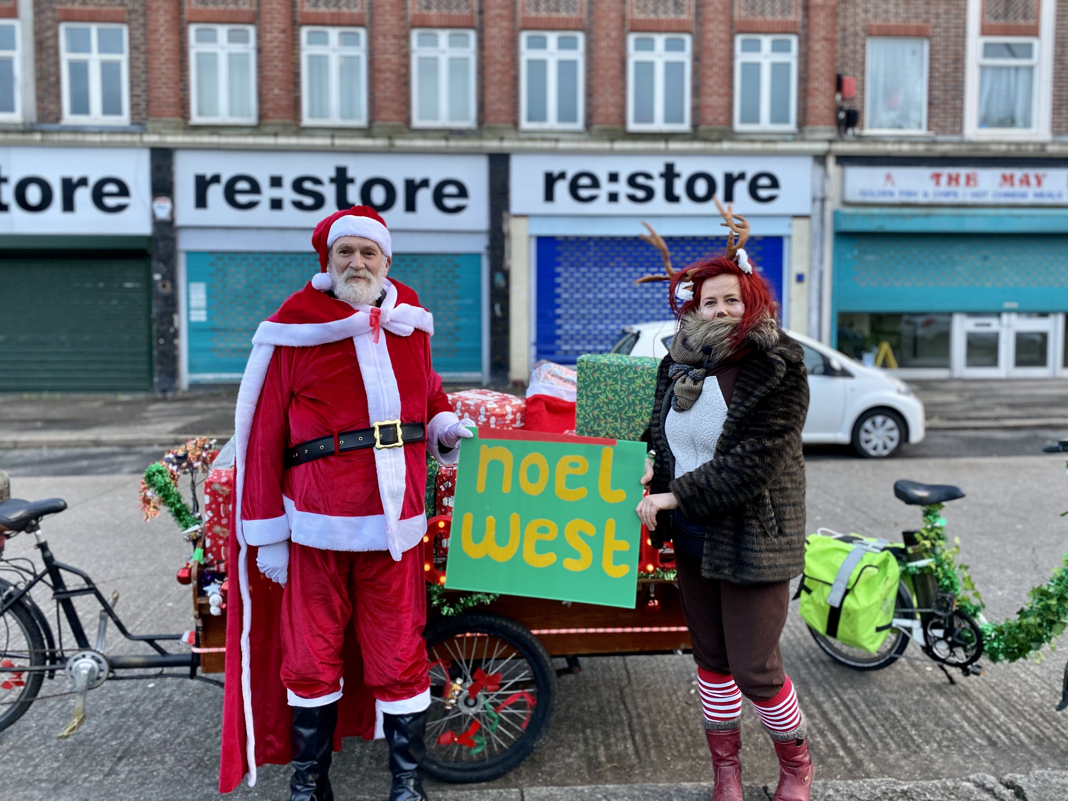 Santa’s ‘sleigh’ was a cargo bike from Redcatch Community Garden, borrowed for the occasion. Photo by Claudia Collins