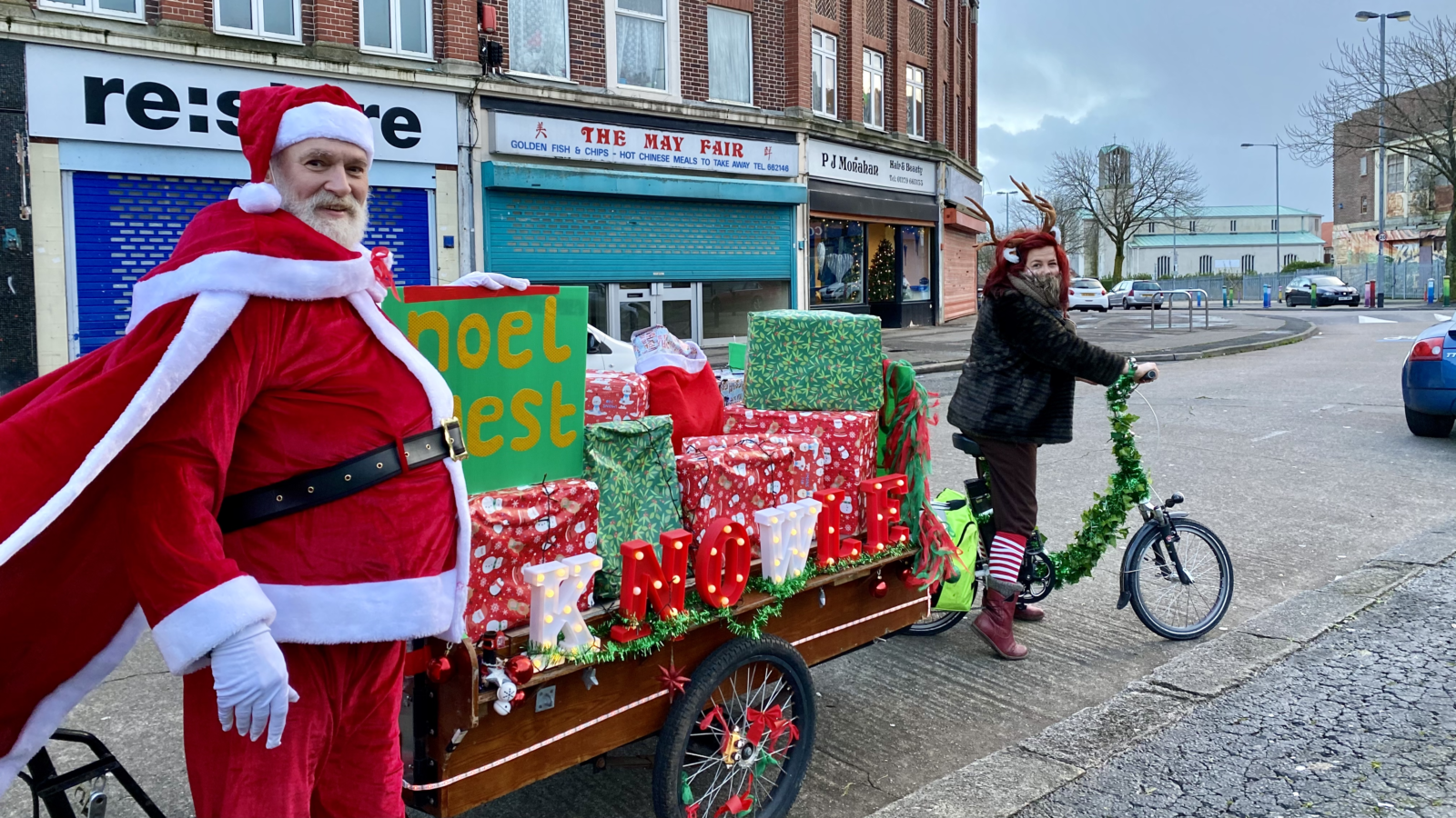 His sleigh is really a cargo bike from Redcatch Community Garden – which has undergone a festive makeover.