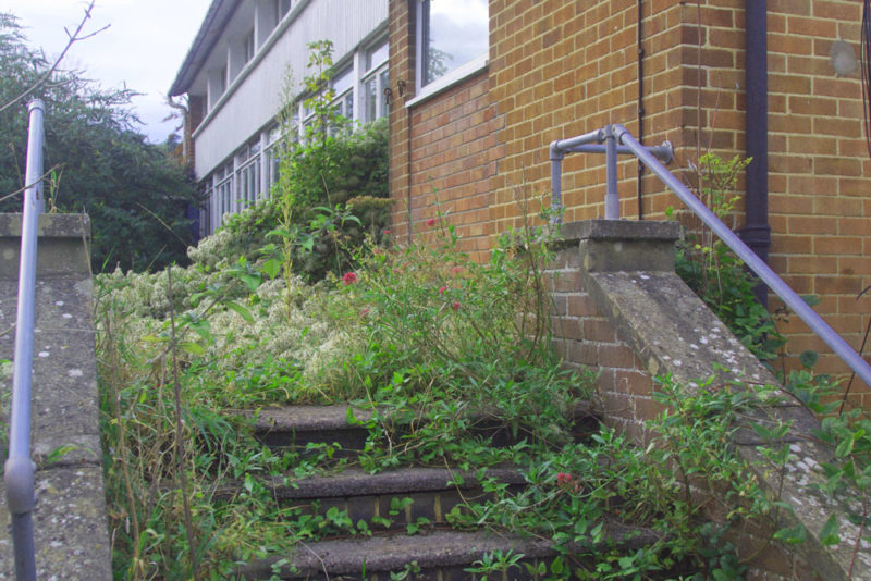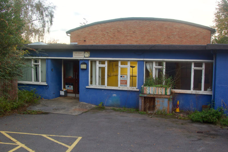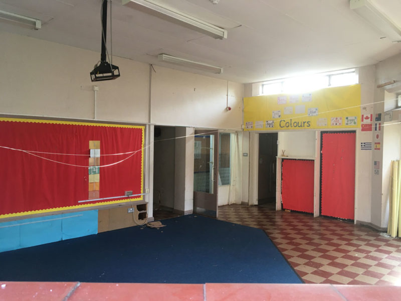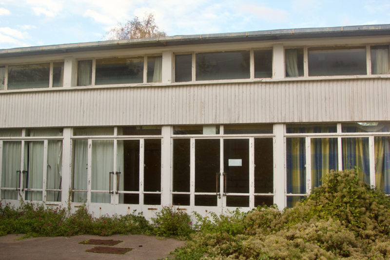 The metal school hall doors with their peeling paint are now shut and locked. Asbestos was a common building material in 1950s schools and now the inside is firmly out of bounds. The hall stands sad and empty, school assemblies just a memory.