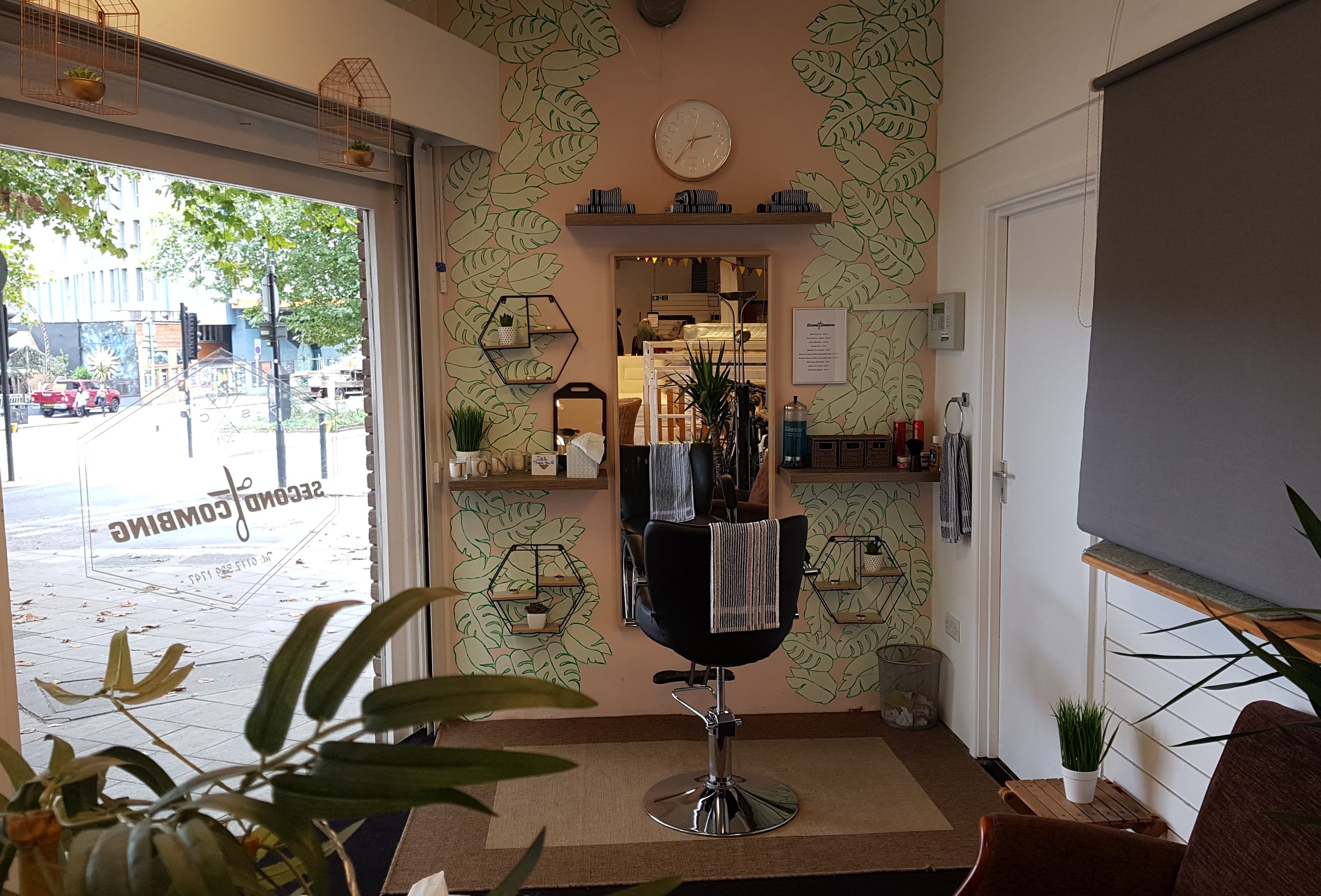 Plants are placed throughout the vibrant space, where a comfortable swivel chair sits before a large mirror set within the statement pink and green wall. A distinctive logo on the outside window advertises the business – The Second Combing.