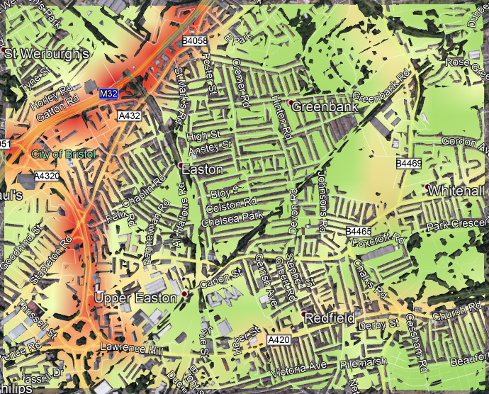 Map of Easton with roads with high levels of air pollution marked in orange. Image from Earth Sense, 2017