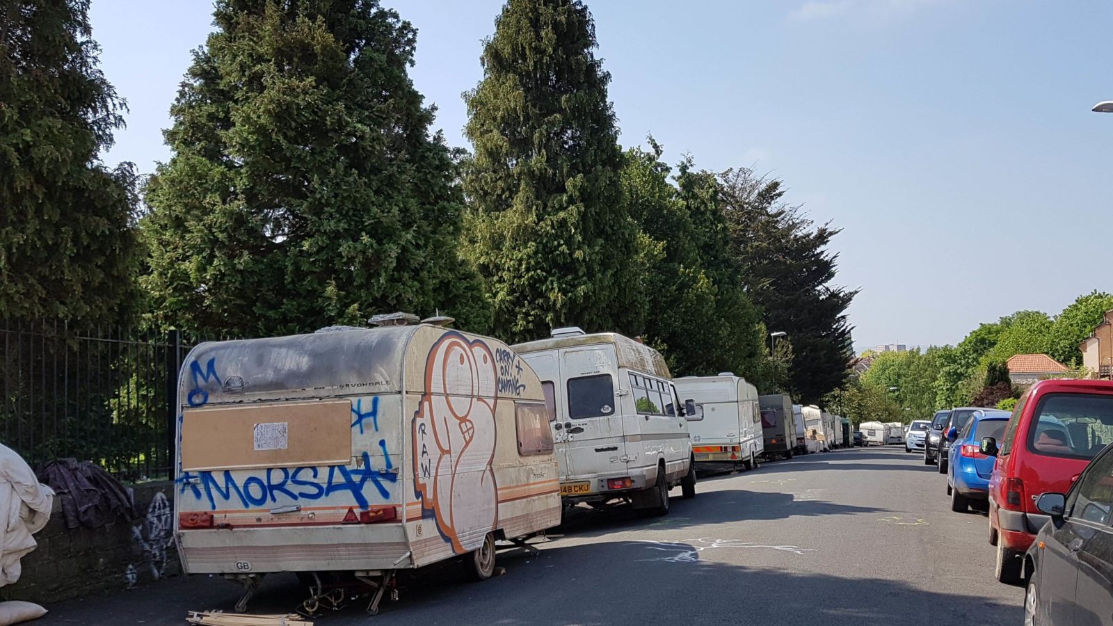 There are around 50 caravans parked along Greenbank Avenue next to Greenbank Cemetery