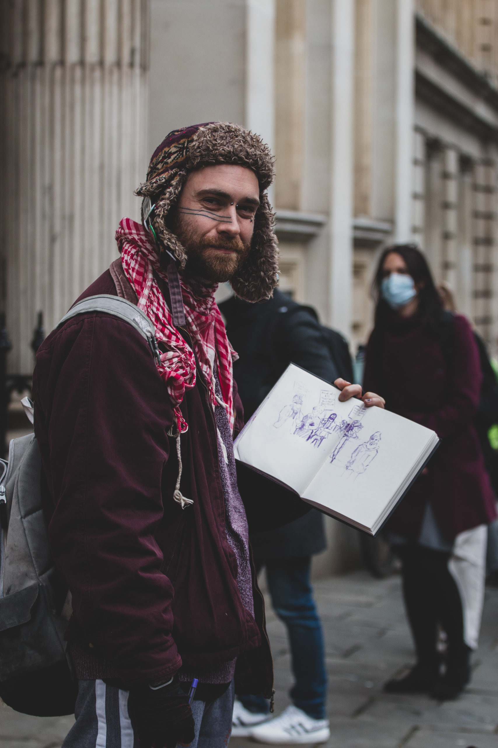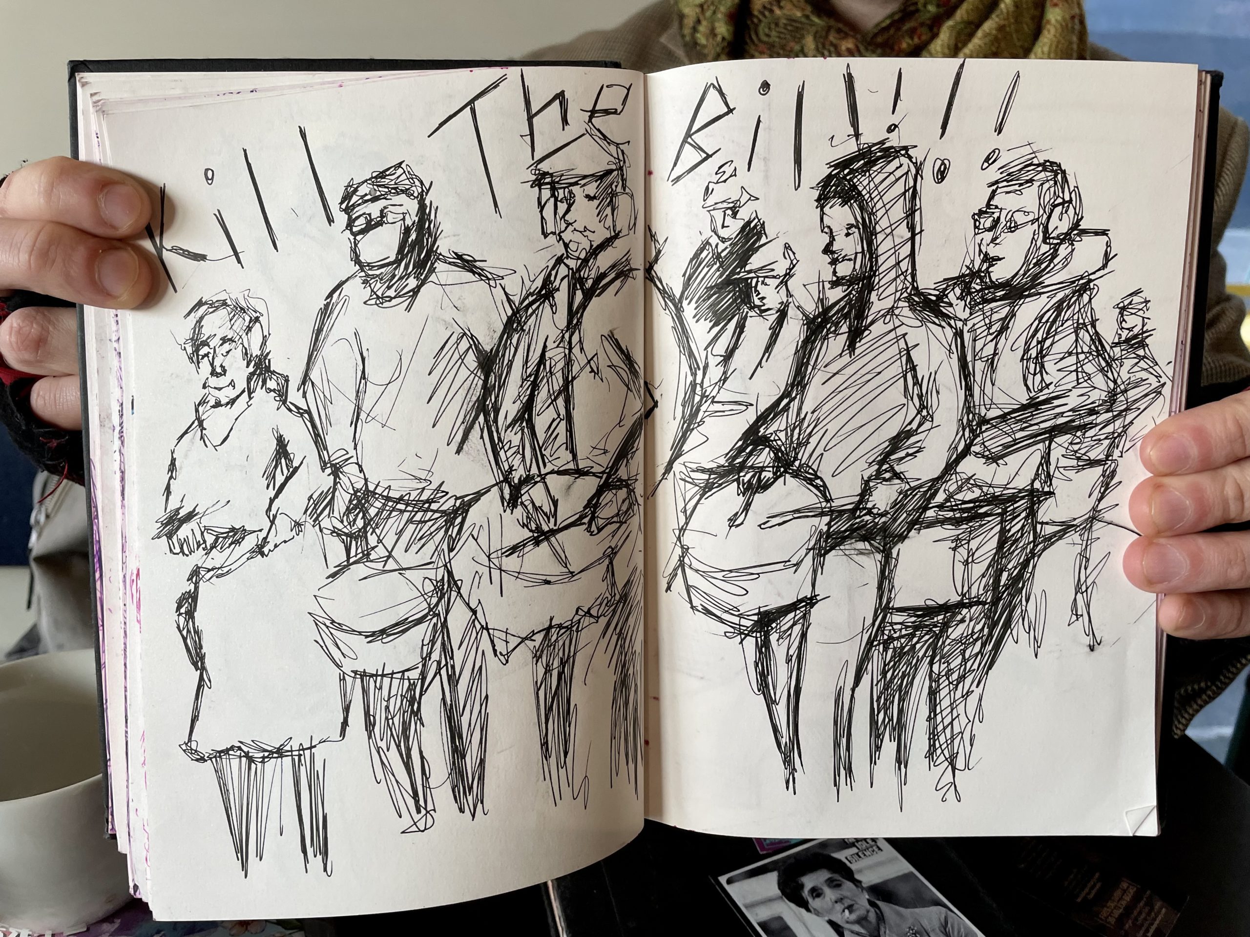 He can usually be spotted at protests in Bristol, not delivering speeches or thrusting billboards in the air, but drifting at the margins quietly scribbling in his sketchbook.