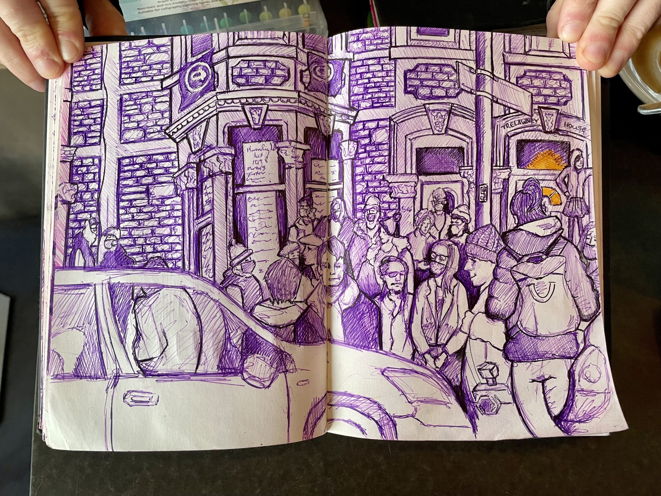 Whether sketching at gigs or protests, Dayne aims to “capture life in its essence” in a way that a photograph cannot.