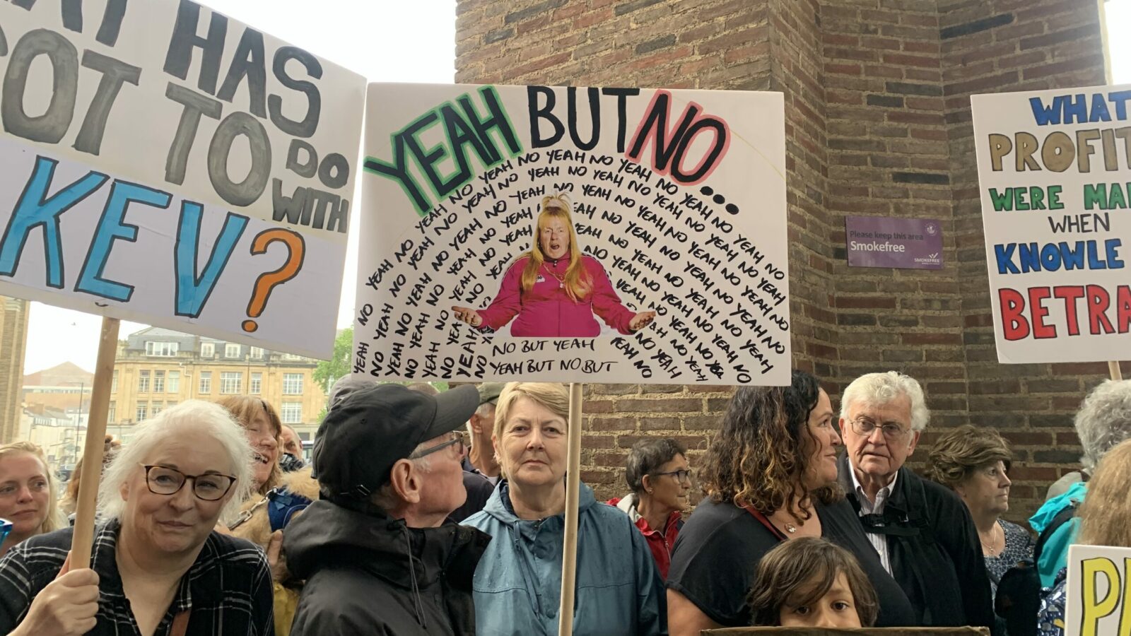 Protestors held a demonstration outside City Hall in September against plans to knock down Broadwalk shopping centre to make way for flats. Many of the placards were directed at chief development committee chair Richard Eddy – photo: Mia Vines Booth