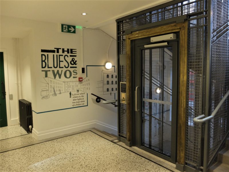 The original lift from the 1930s has been restored and kept as a centrepiece. The second floor pays homage to the building’s history as a police station.