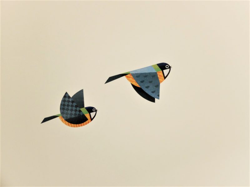 Hand-drawn pictures of birds adorn the walls