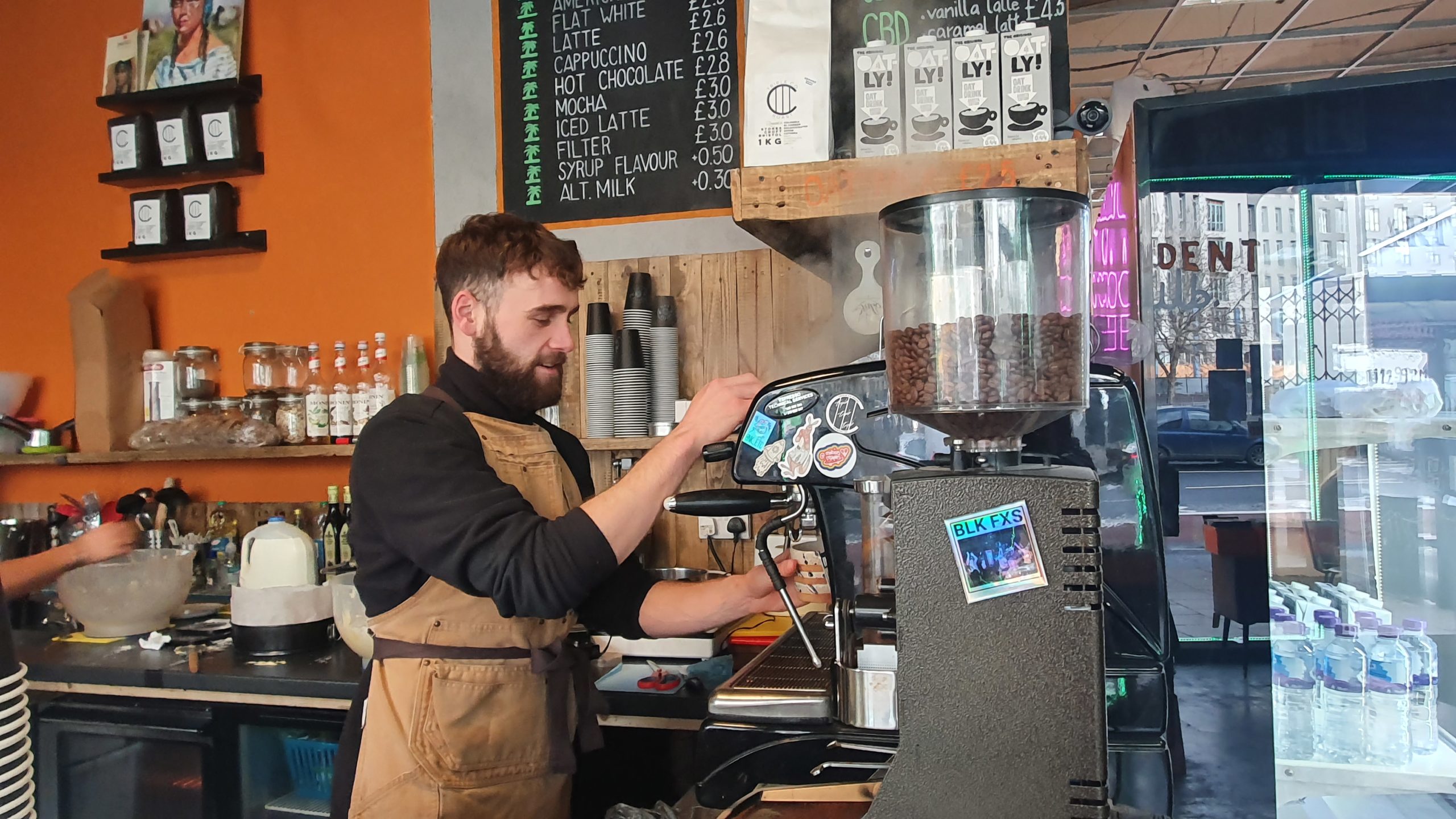 Inside, behind the counter of Coffee & Vinyl, Francis Reilly, is busy mixing a mango and lime cake. He opened the doors to the new business in a former e-scooter shop three weeks ago and believes it is independents who will revive the city centre high street.
