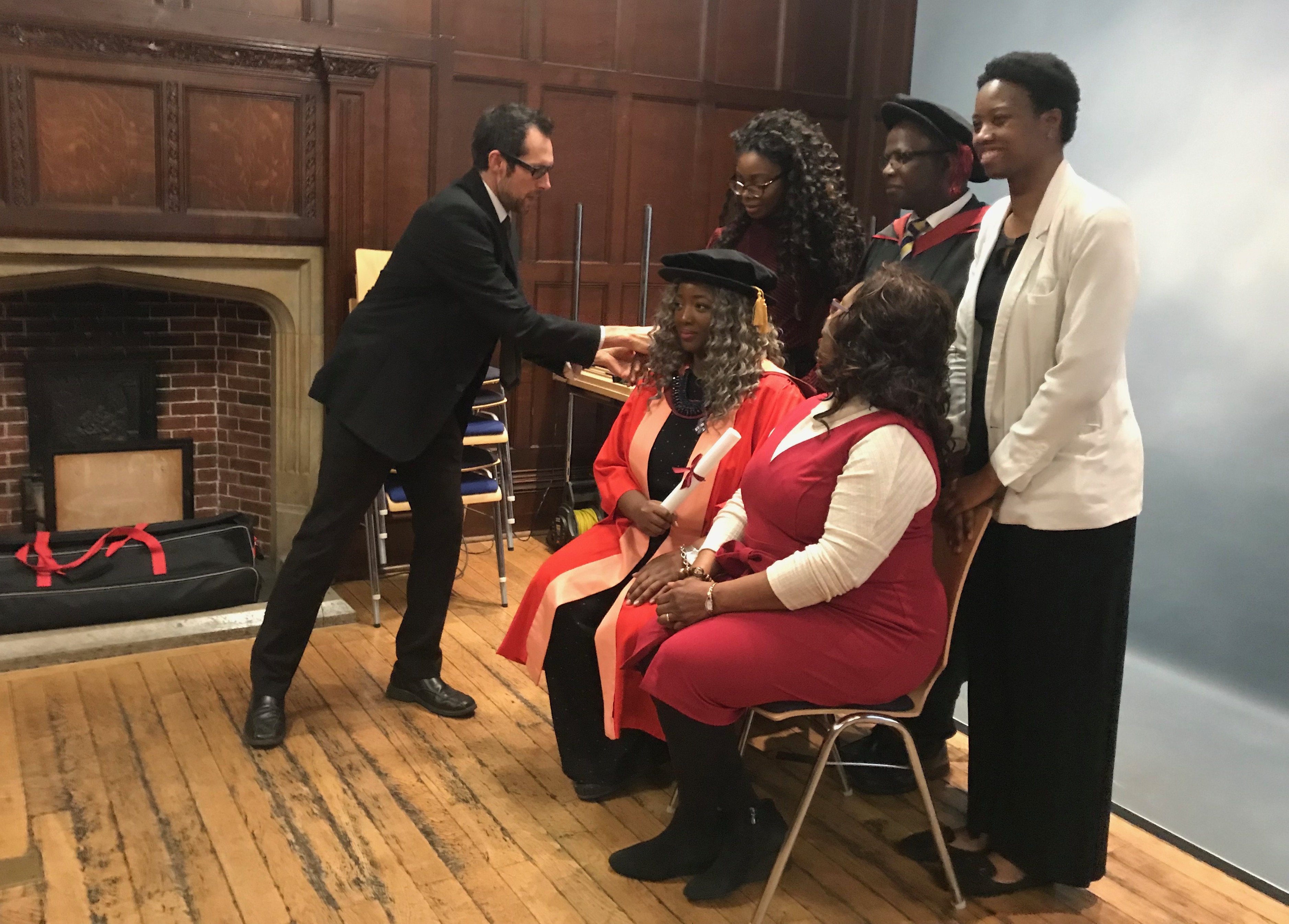 Honorary graduate Anne-Marie Imafidon (sitting, with cap) prepare for the official photos after the ceremony