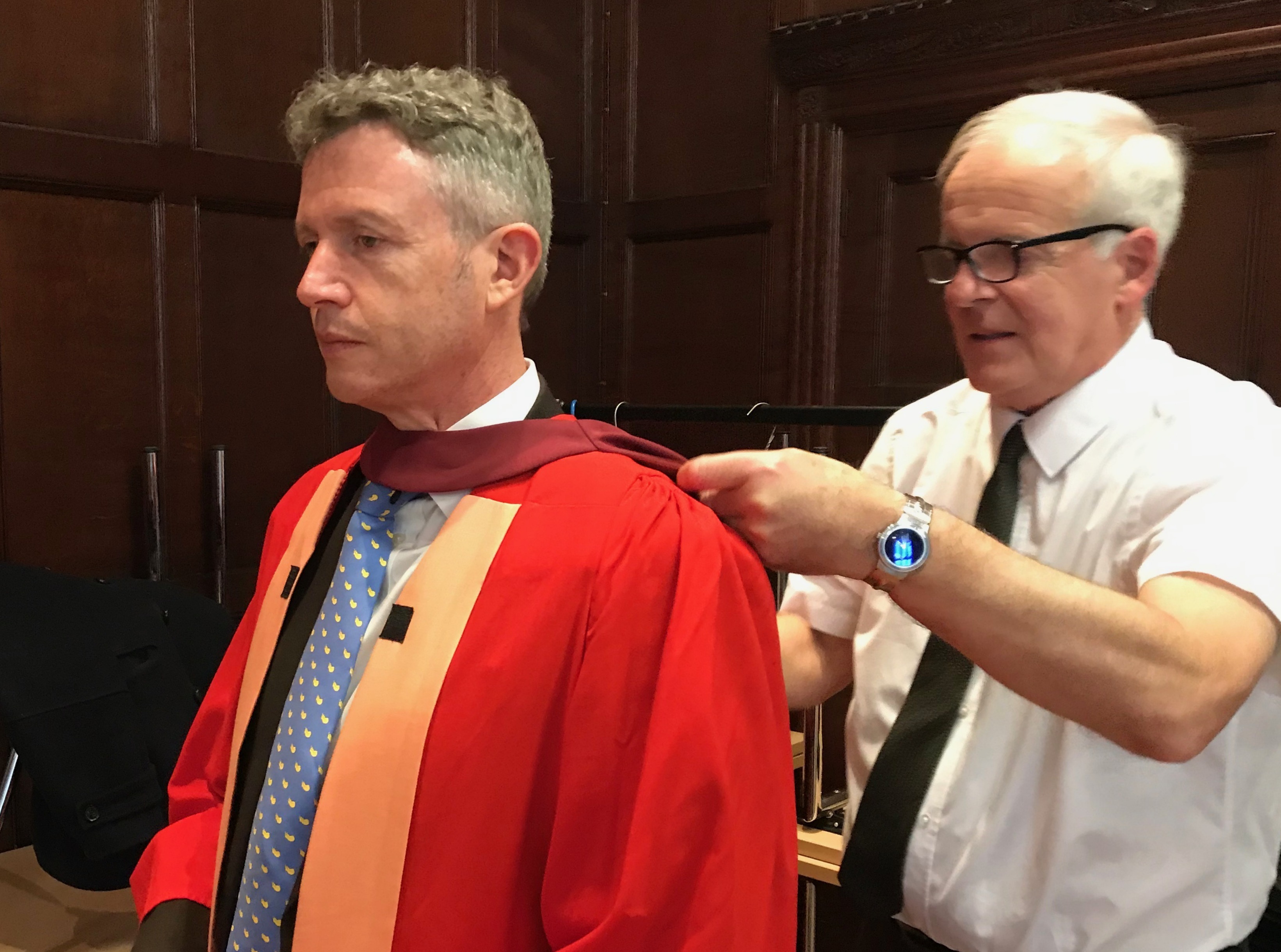 Brian Halford helping honorary graduate Paul Lindley into his gown