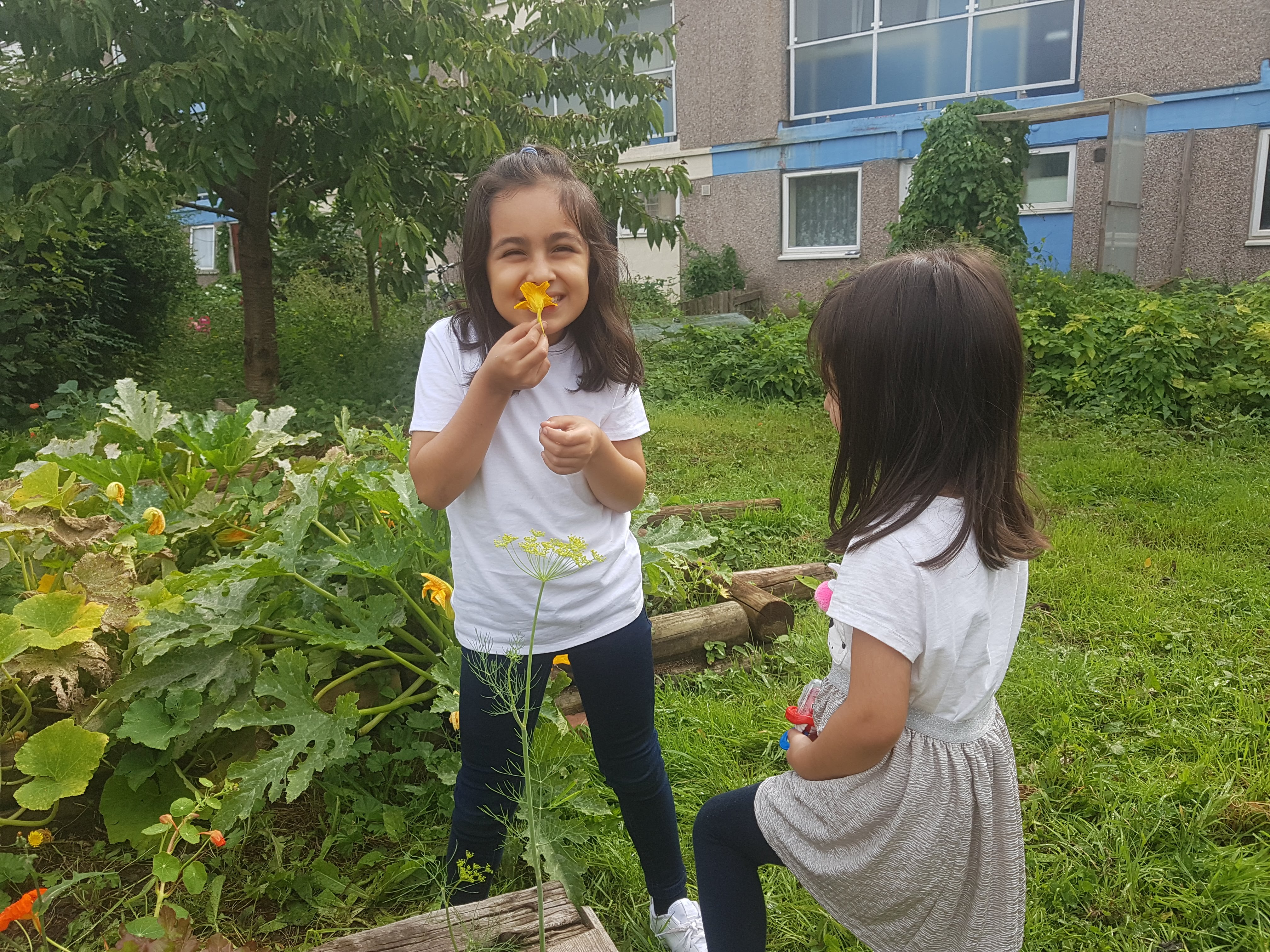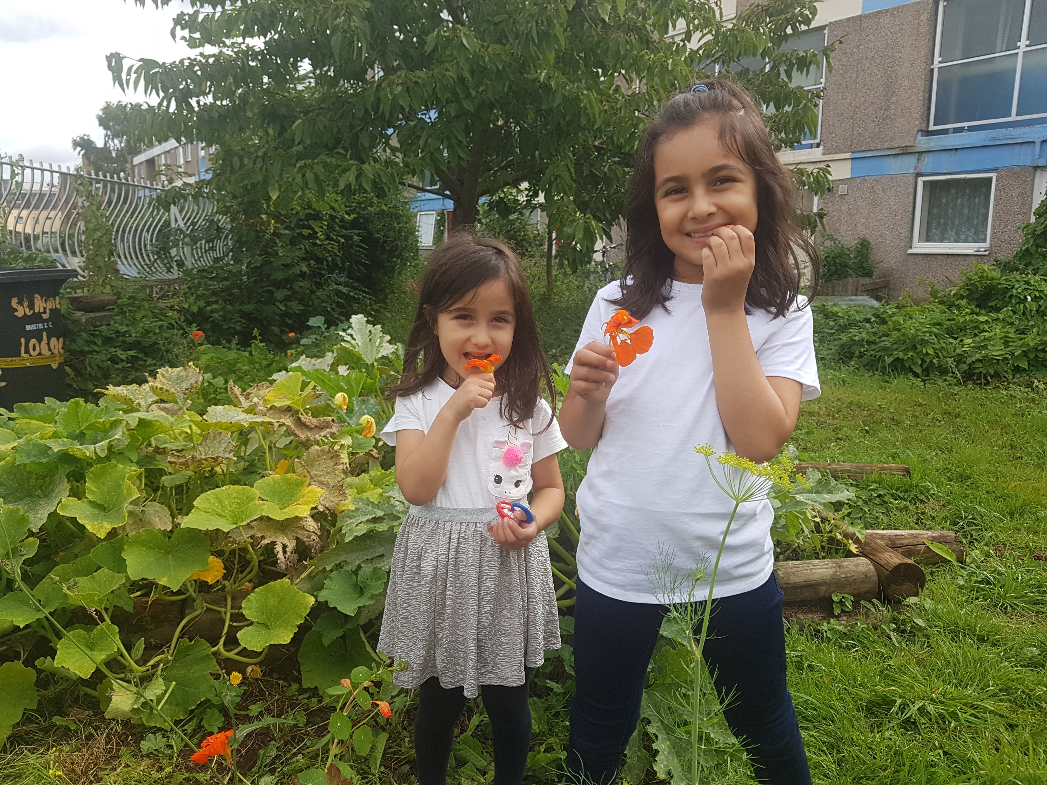 On a recent Thursday morning, two small girls bound happily across the grassy space, handing out edible flowers and rooting through the foliage to show off the giant courgettes growing beneath.