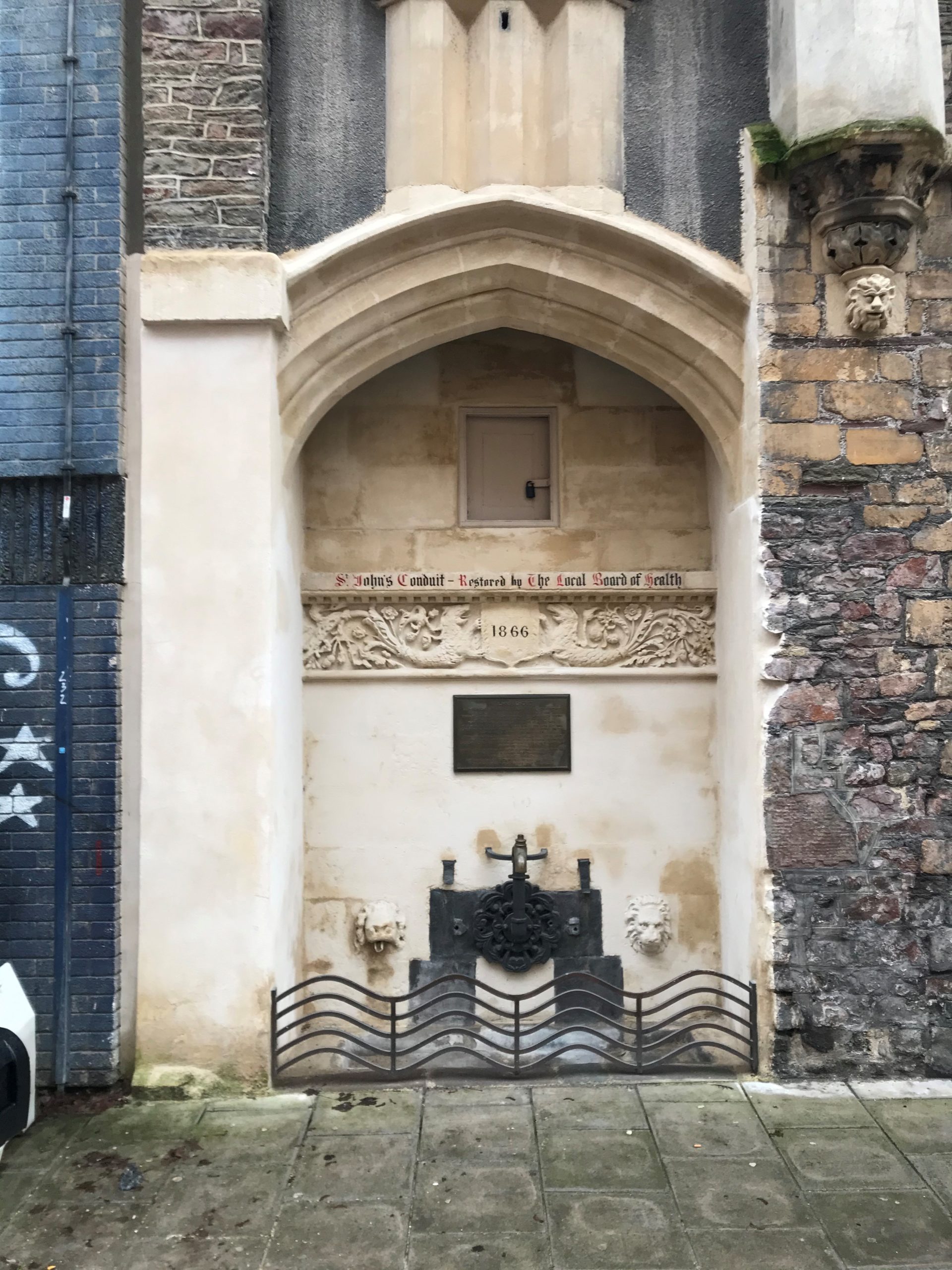 St John’s Conduit, a key water supply that once served the old walled city of Bristol. The supply began at Brandon Hill, through pipes down Park Street and was conveyed by a feather pipe from the Carmelite Priory cistern on what is now the site of Bristol Beacon.