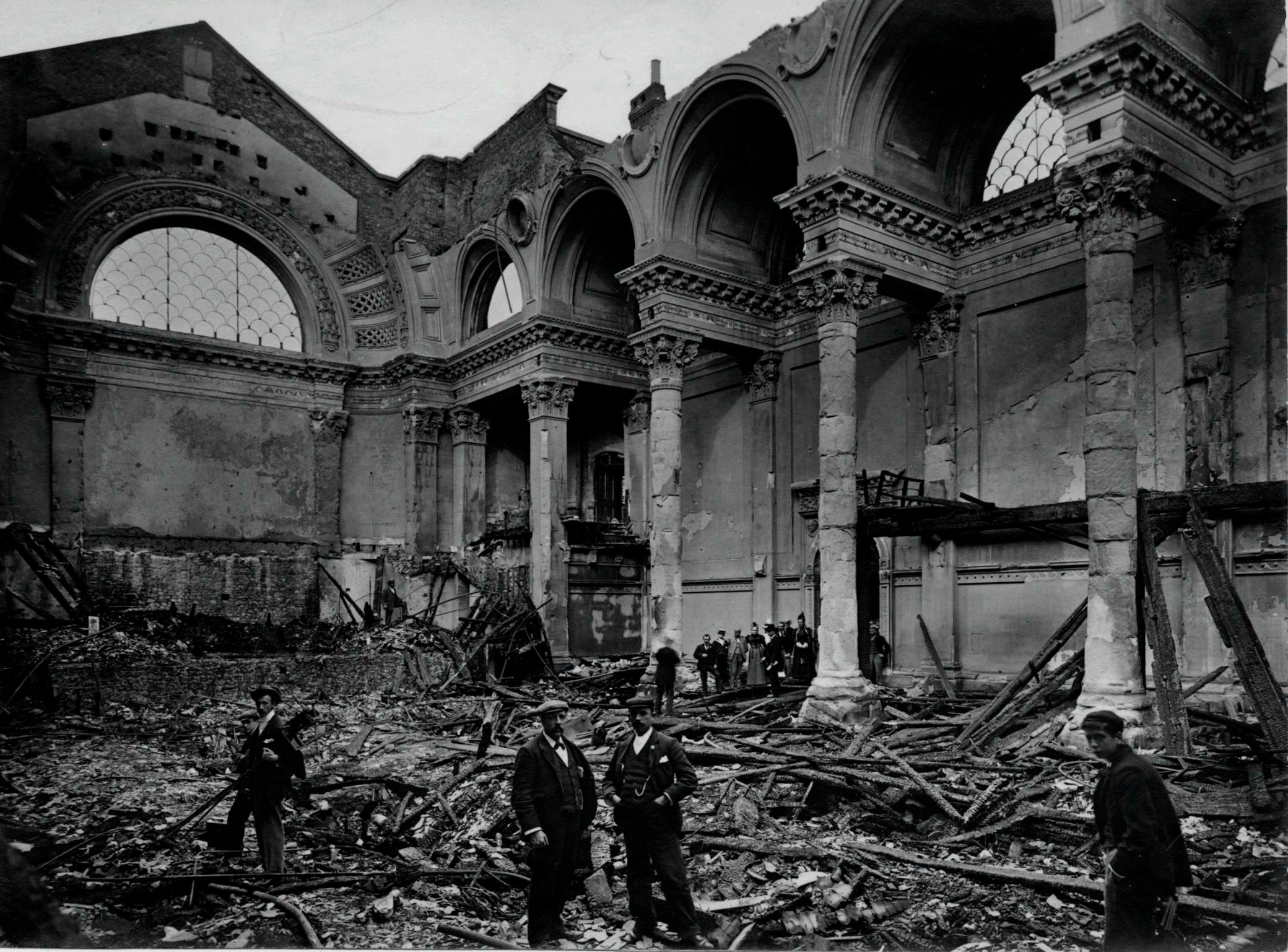 The aftermath of the 1898 fire, when the main hall’s organ was destroyed along with its roof – photo: Bristol Archives