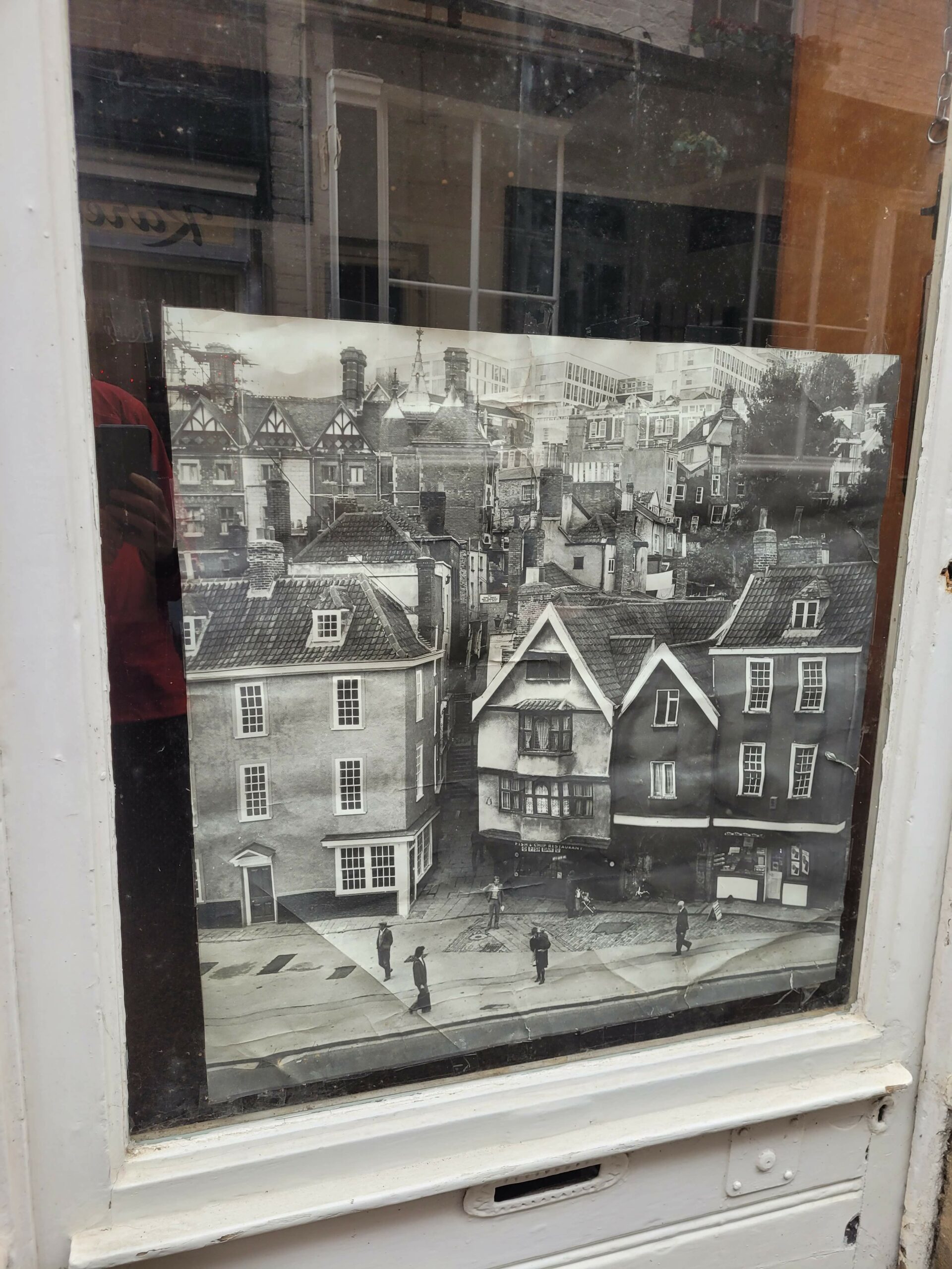An old photo of the Christmas Steps in the window of a former stamp shop