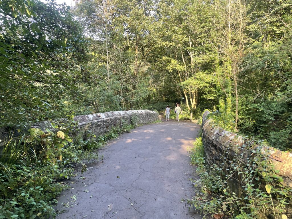 The bridge over the Frome on Wickham Glen within Eastville Park is made out of pennant rubble, with two semicircular arches separated by an upstream cutwater, a smaller western arch, parapet and rock-faced copings according to its English Heritage listing.