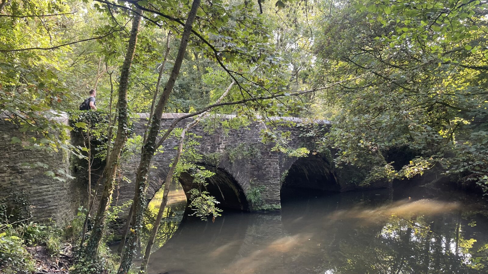 The bridge over the Frome on Wickham Glen within Eastville Park is made out of pennant rubble, with two semicircular arches separated by an upstream cutwater, a smaller western arch, parapet and rock-faced copings according to its English Heritage listing.