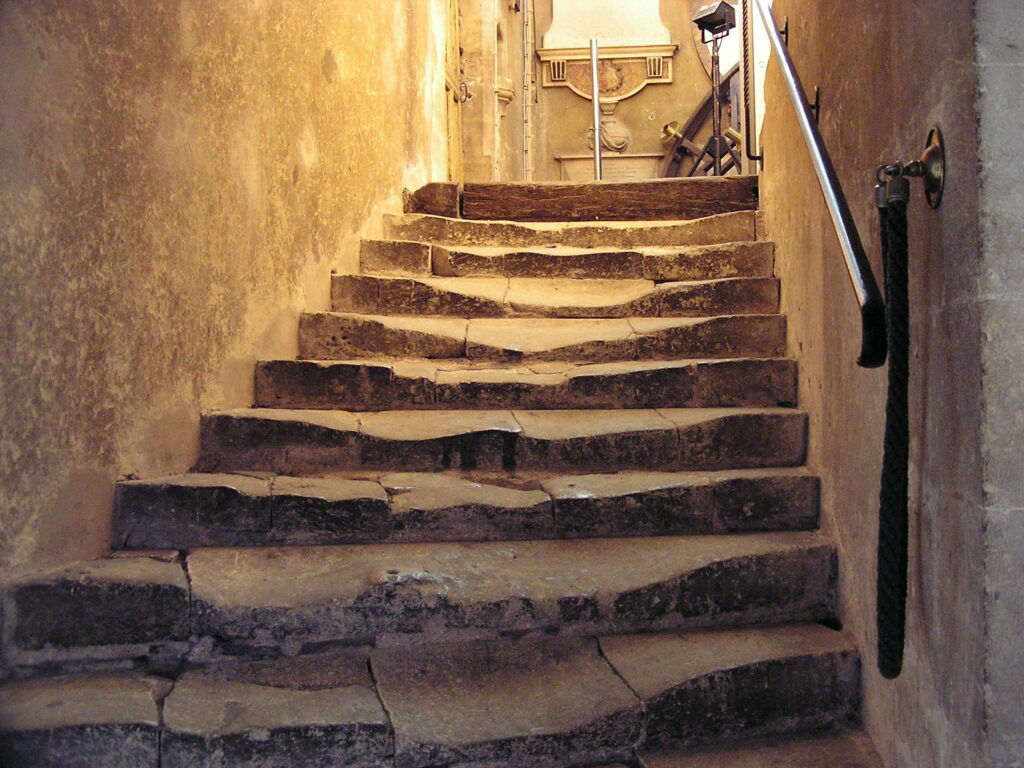 The steps of the night stairs have been worn due to centuries of use and are now covered by protective wooden steps.