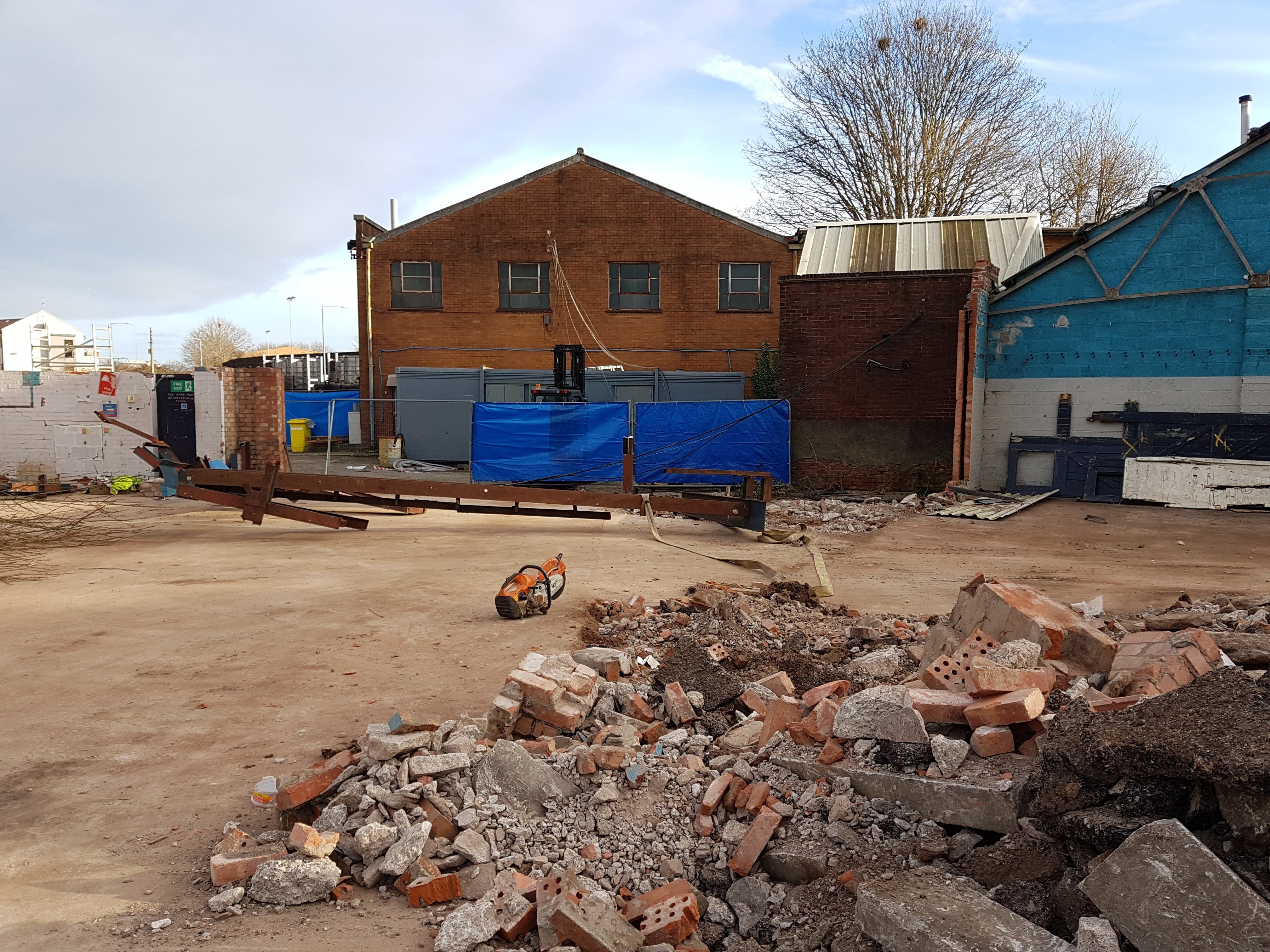 A skip sits in the middle of the barren Spring Street site, where piles of rubble await clearing from the rusty-coloured concrete ground.