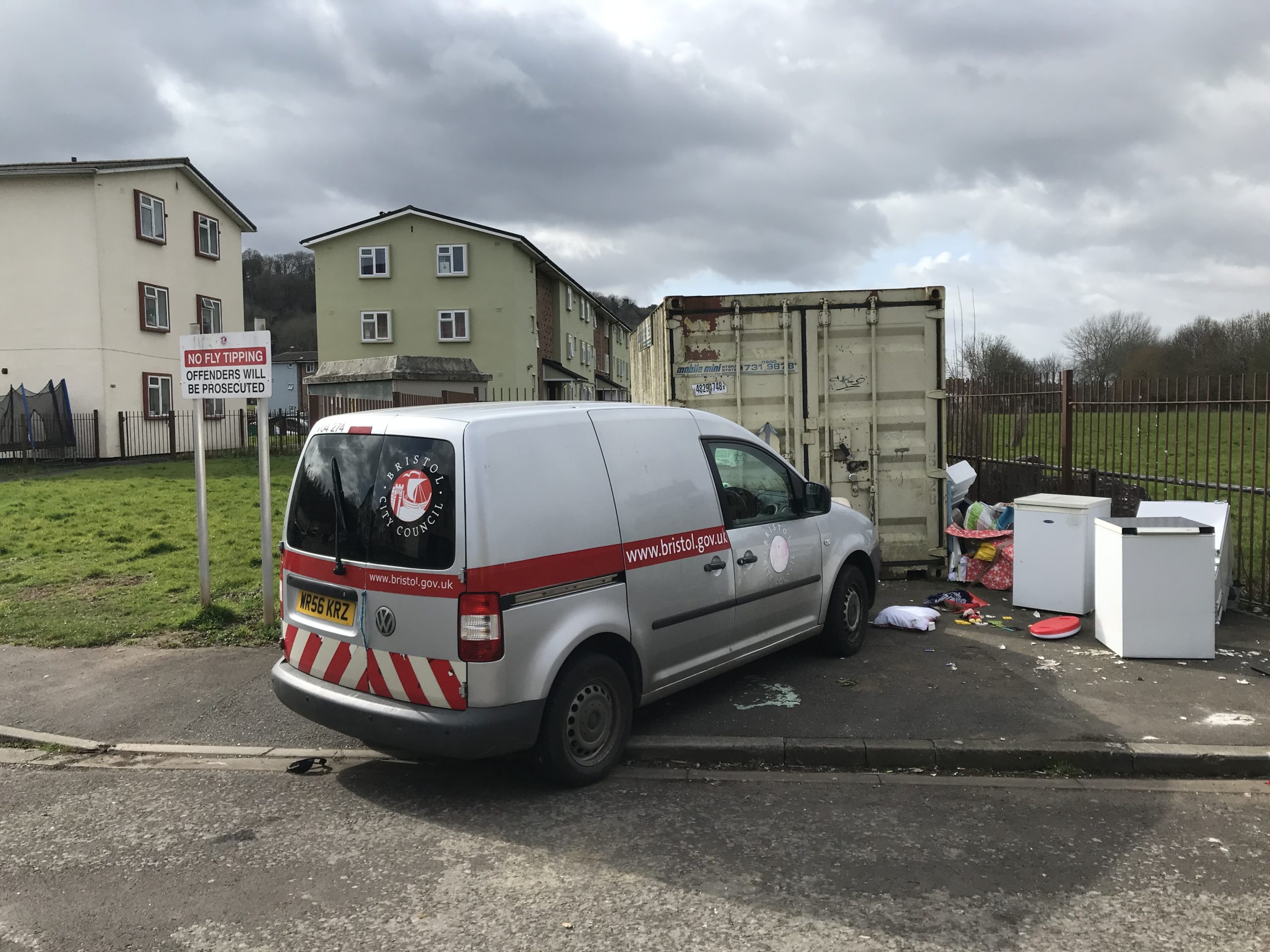Close to the entrance to Lawrence Weston’s BMX track on Henacre Road, a ‘no fly tipping’ sign was having no effect whatsoever on Monday, with a dumped mattress even leaning against the bonnet of a Bristol City Council van.
