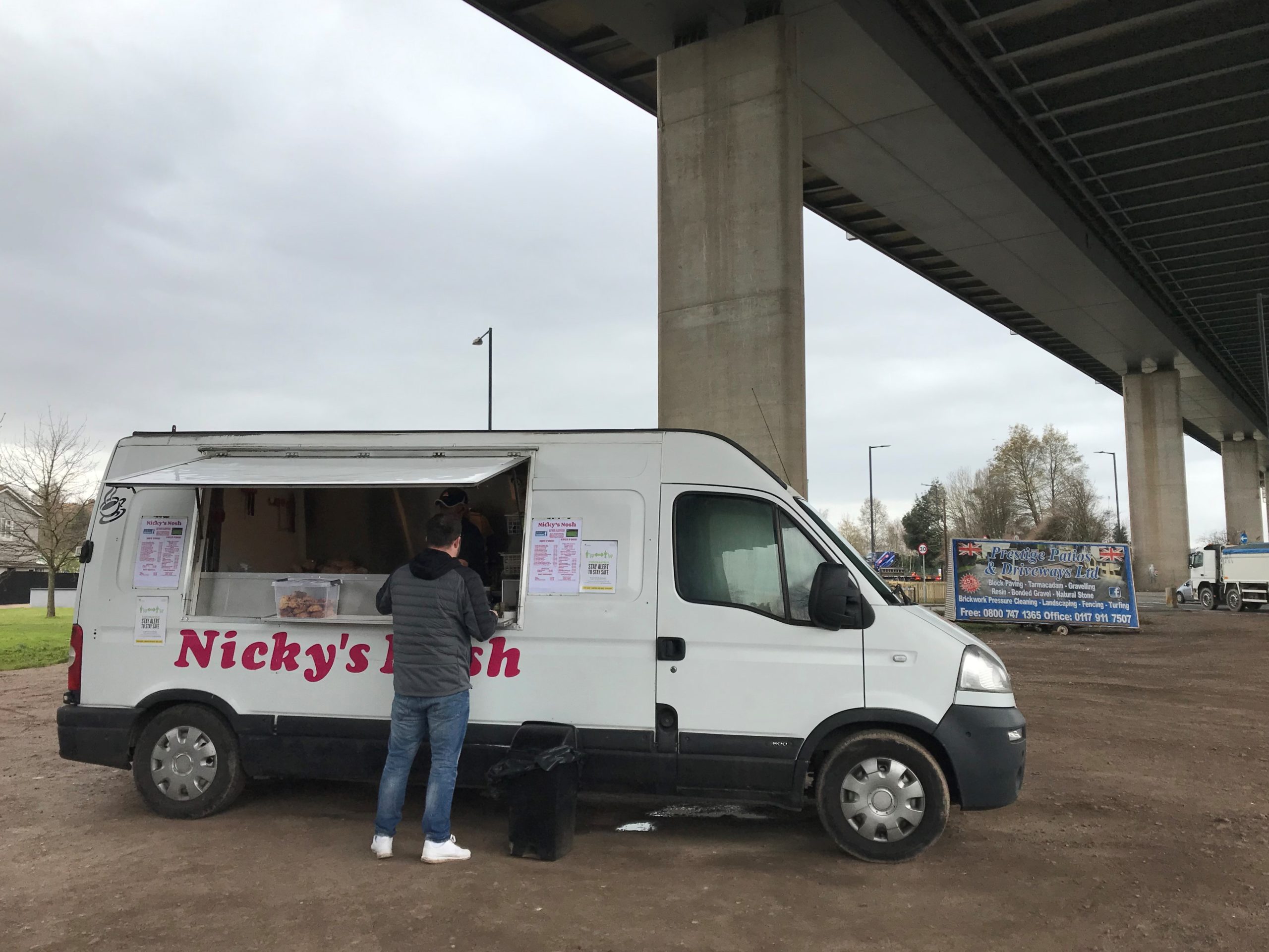 On a patch of land underneath the M5 in Avonmouth, between West Town Road and the Portway, Nicky’s Nosh was doing a brisk trade soon after 10.30am on a recent Monday morning.