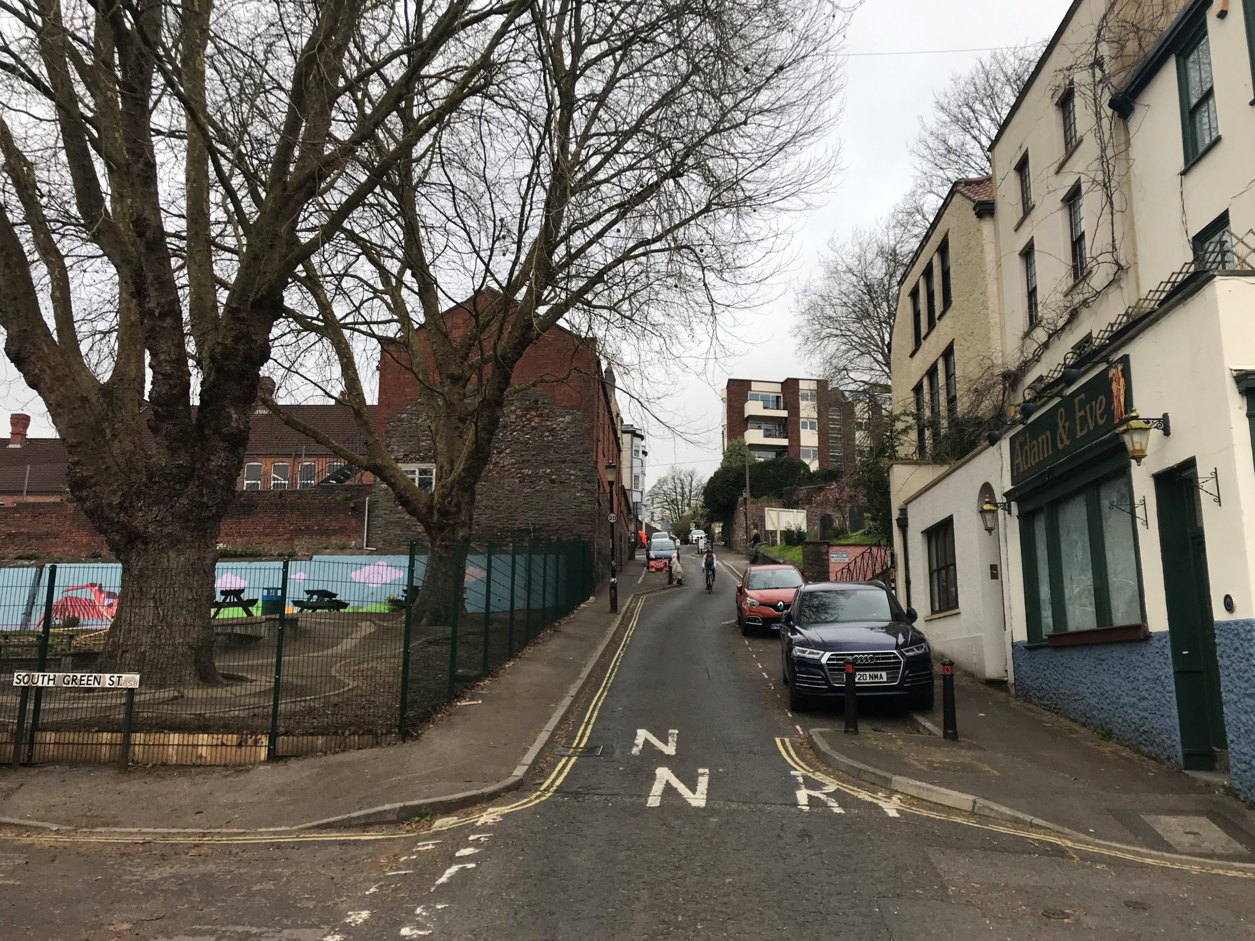Opposite the recently installed new boundary fencing and gates – paid for by funding from Bristol City Council – sits the sadly empty Adam & Eve, now unlikely ever to return to being a pub and a building that developers want to turn into into flats.