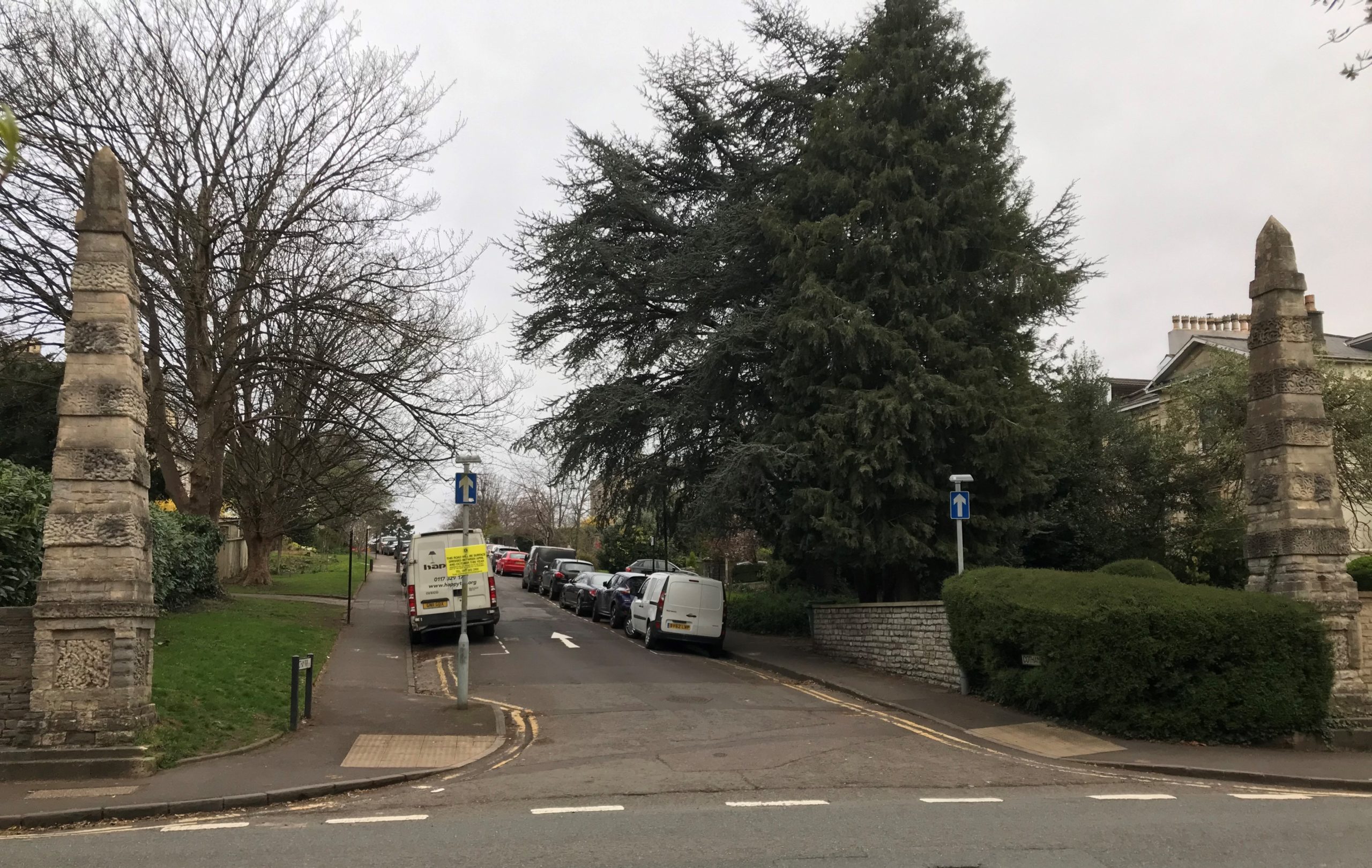 The two 18th-century obelisks flanking the entrance to the former Cotham Park estate are Grade II listed – photo: Martin Booth