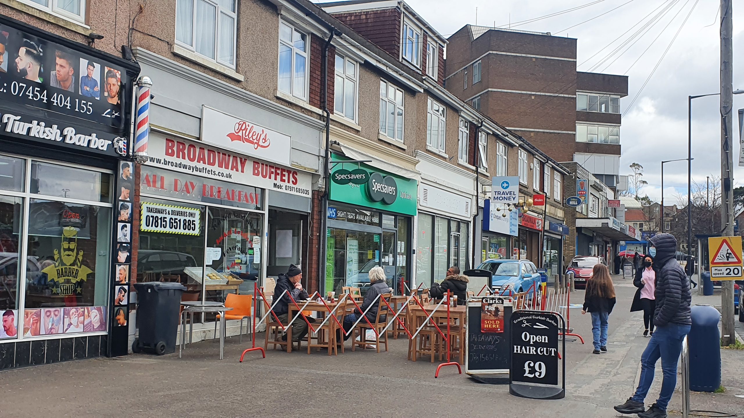There’s a chilly wind sweeping over the hill but that doesn’t put off the people sat at tables outside Broadway Buffets, hands wrapped around steaming mugs as they await their orders.