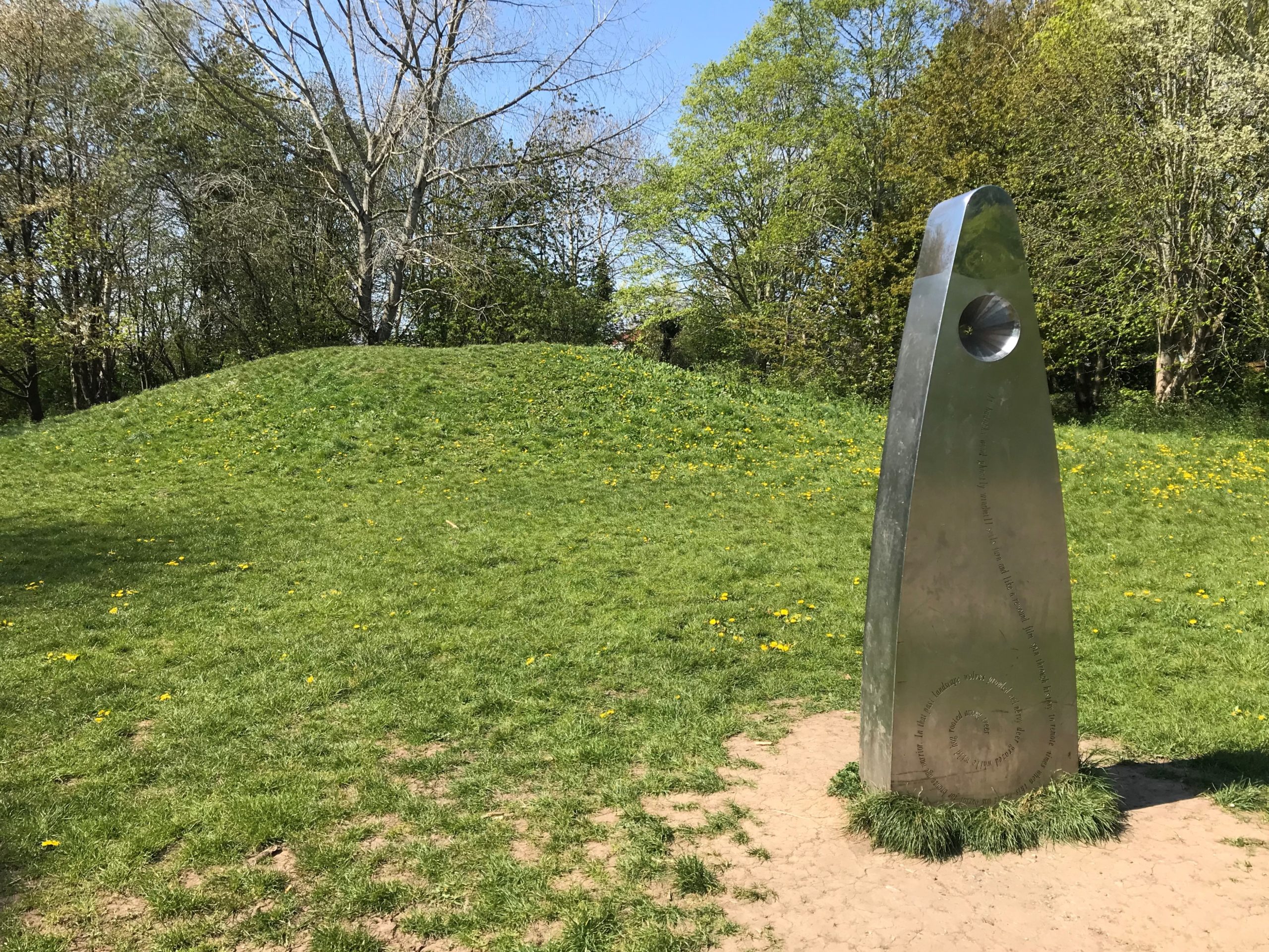 The Southmead Round Barrow in what is now Badock’s Wood was constructed around 1300 BC. A sculpture by Michael Fairfax marks the location – photo: Martin Booth