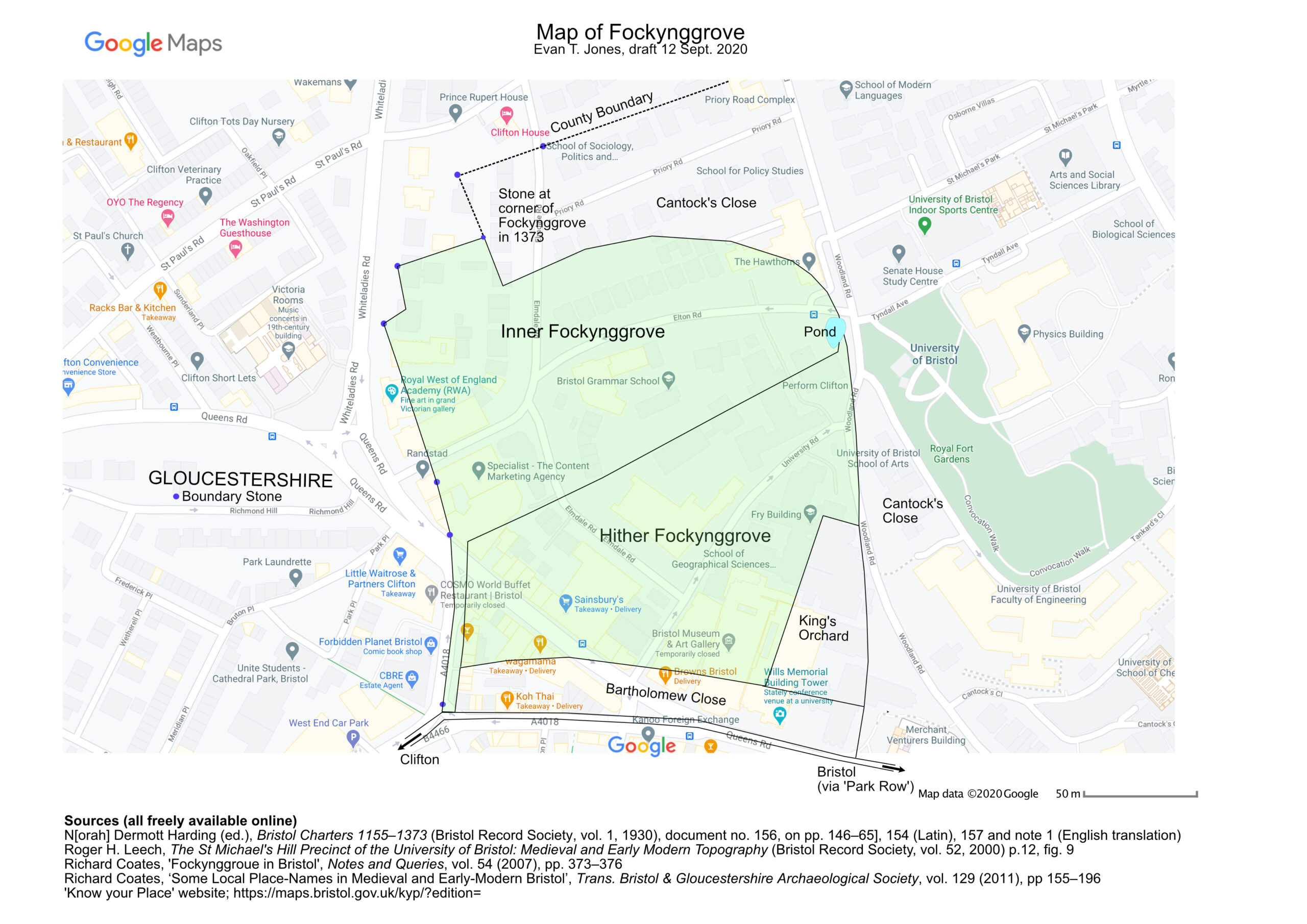 Hither Fockynggrove and Inner Fockynggrove sat on the northern boundary of the city and county of Bristol in 1373. They were located around where Bristol Grammar School is today according to this map by Dr Evan Jones from the University of Bristol.