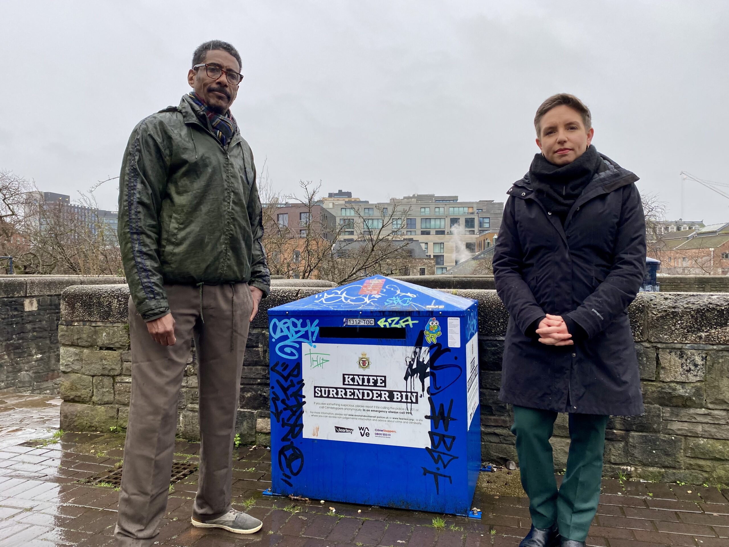 Green councillor Mohamed Makawi and Green co-leader Carla Denyer stand by a knife surrender bin in Castle Park, where Mohamed’s friend died last year – photo: Mia Vines Booth