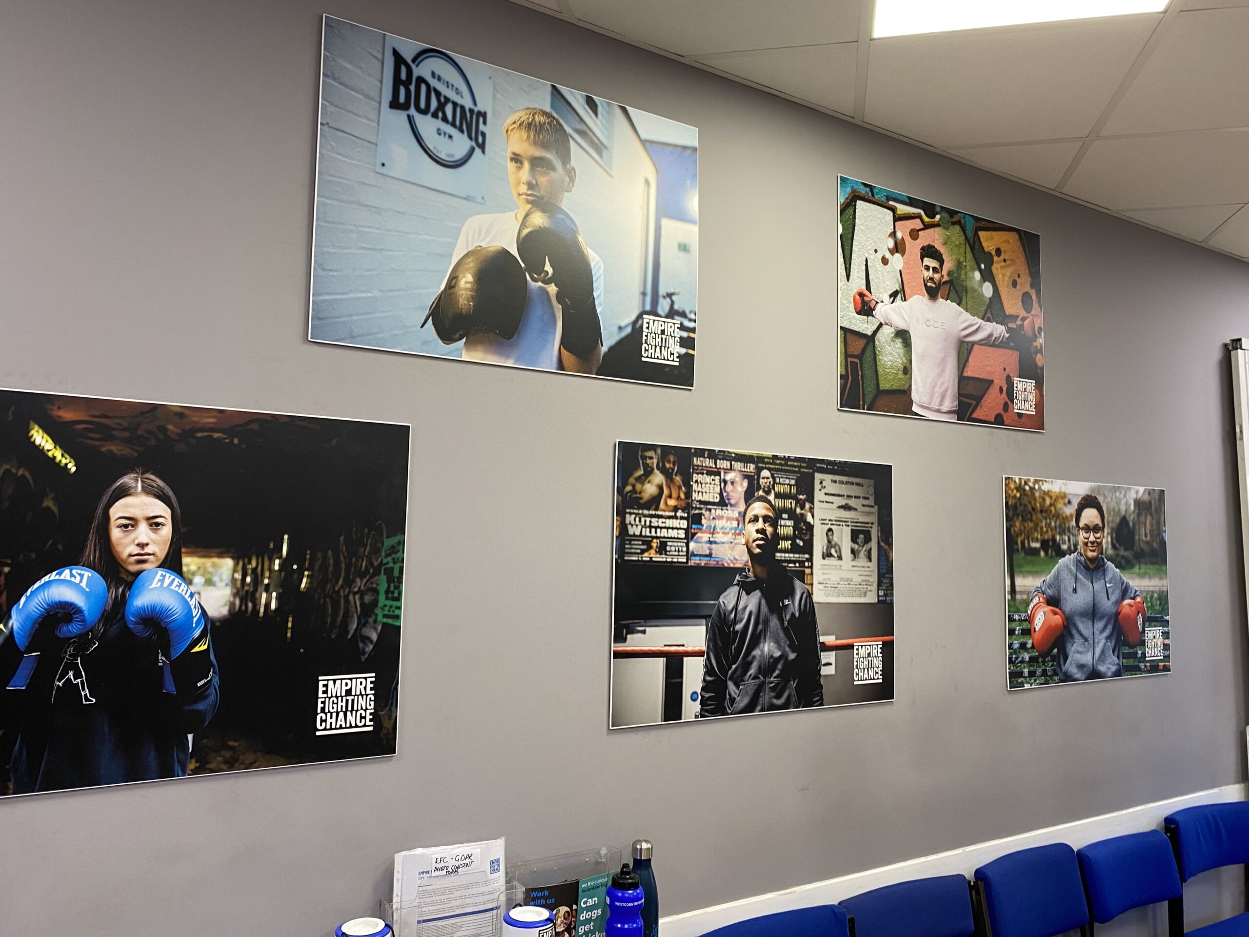 The walls of Empire Fighting Chance are lined with young people that have passed through the gym, including Dontae Davis (centre bottom) – photo: Mia Vines Booth
