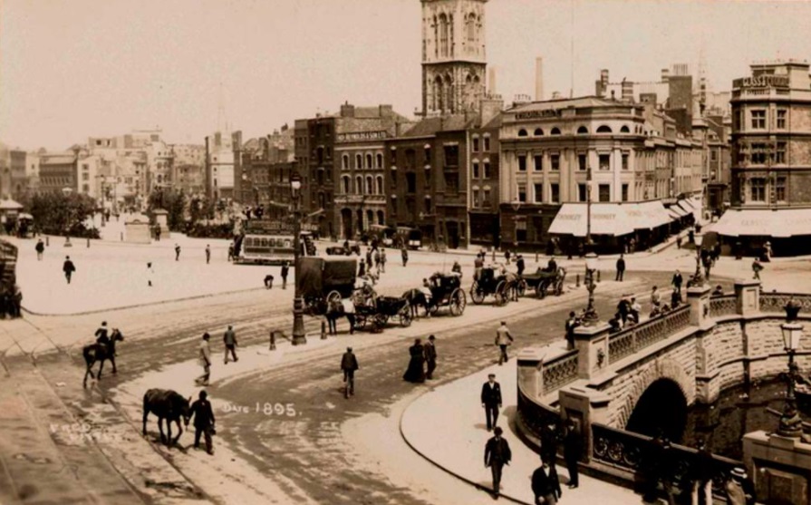 The centre in 1895, with horse-drawn carriages waiting on St Augustine’s Bridge which had only been constructed a few years’ previously – photo: Bristol Archives