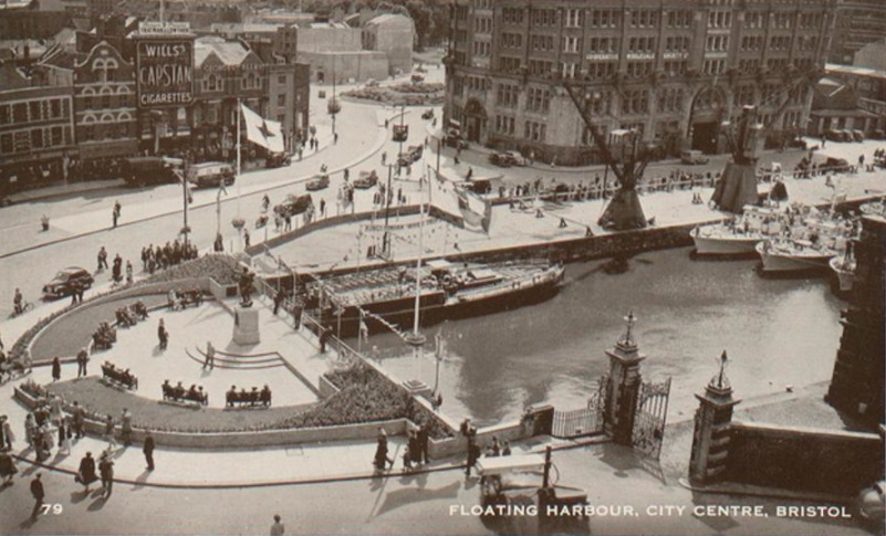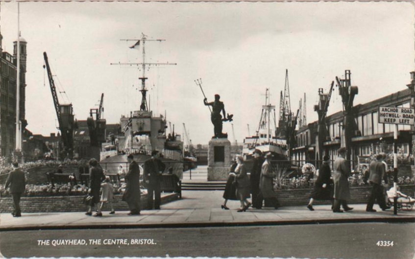 A postcard from the 1940s of two ships in the quay, with the statue of Neptune in the middle close to where the Cascade Steps are located today – photo: Bristol Archives