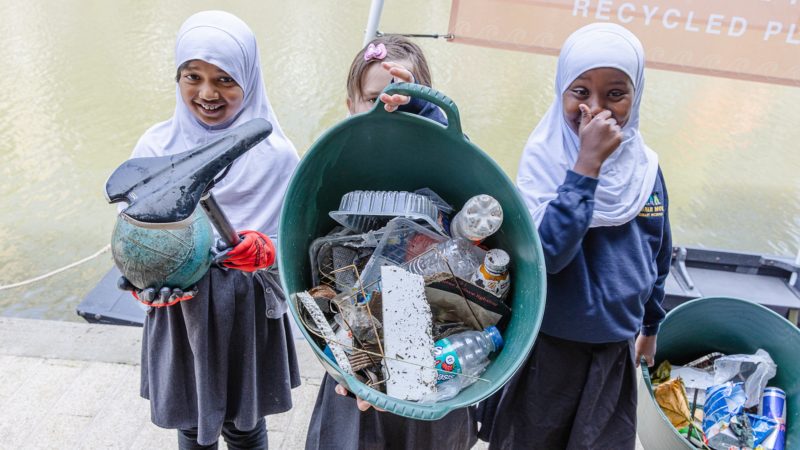 School children pick litter with Clare Marshall, company director at Sustainable Hive – photo by Paul Driver/ Hubbub
