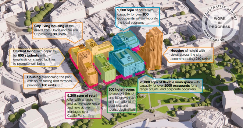 Developers Deeley Freed – whose director David Freed is currently the leader of the Merchant Venturers – hope that building high “can contribute to Bristol’s housing and affordable targets, take pressure of greener, more car reliant sites, support Bristol Shopping Quarter with greater footfall; and have a smaller footprint meaning more space for public realm”.