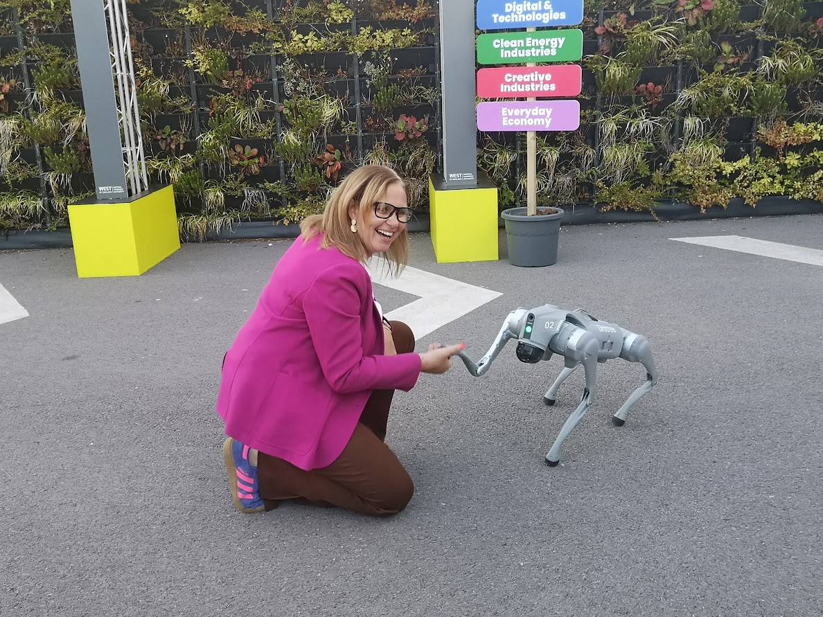 Mayor Godwin with articulated robotic dog unleashed from BDFI