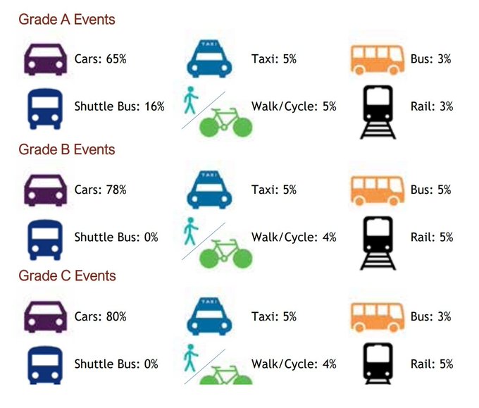 “The 65% car mode share shown includes the cars driving to the Park & Ride sites. If you just counted the car trips parking or dropping off passengers at the arena, the car mode share would be 35%.