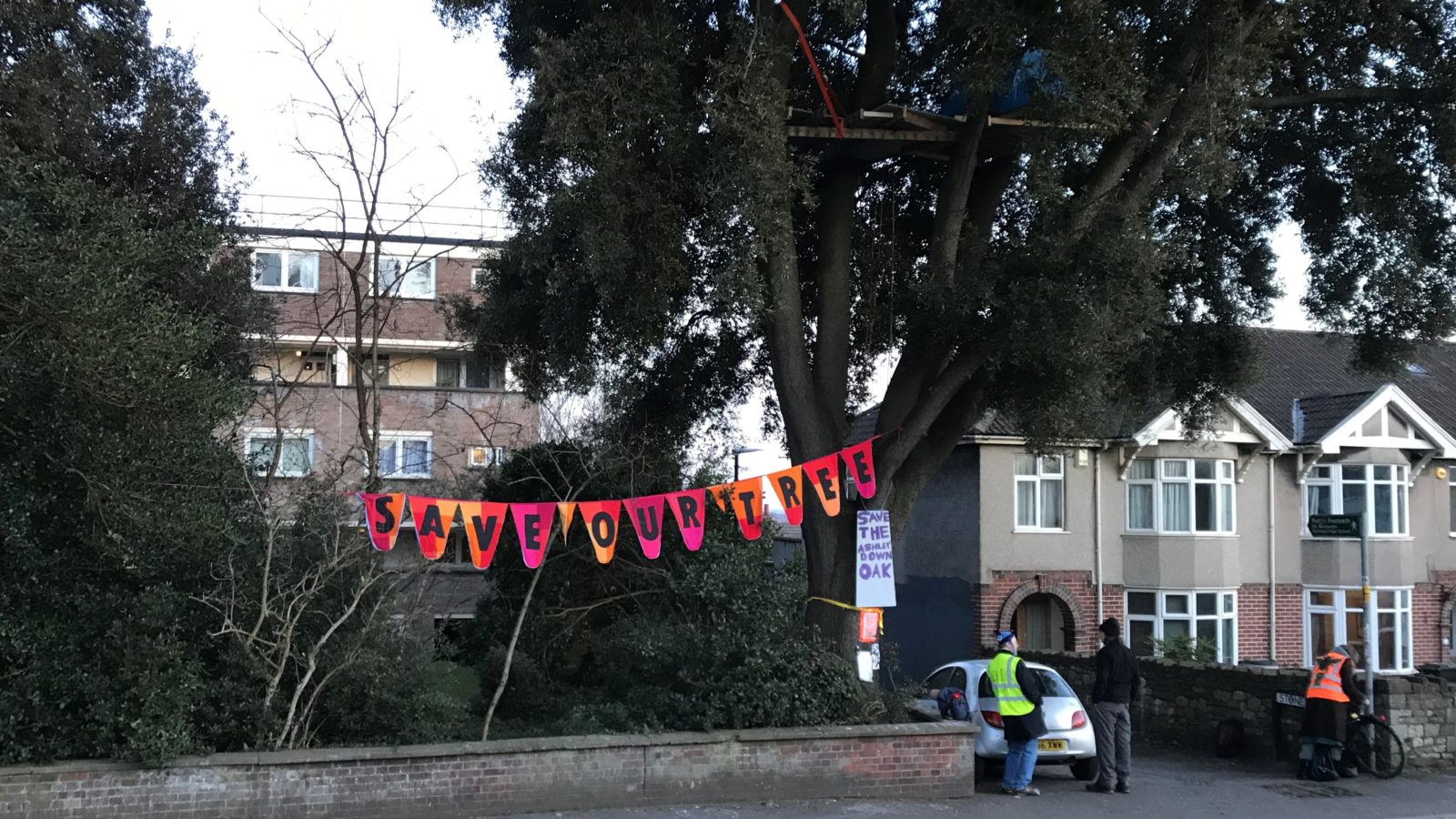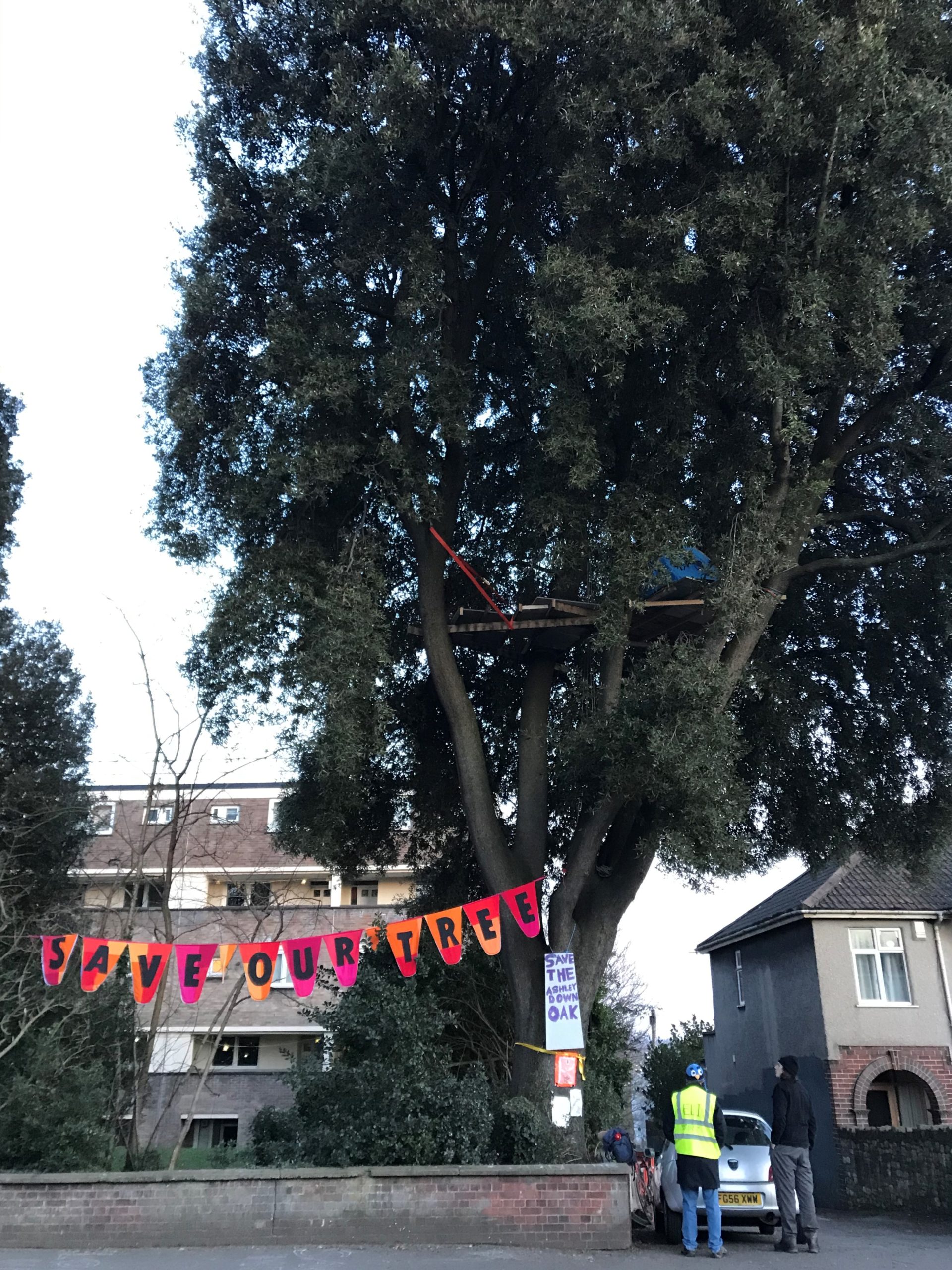 Members of newly formed campaign group, Save The Ashley Down Oak (STADO), have built a platform in the holm oak whose felling the council say is “unavoidable”.