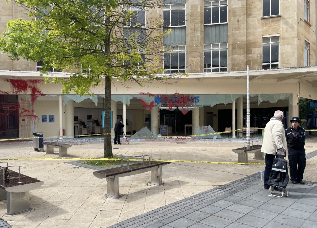 Activists have smashed almost all of the windows of Barclays in Broadmead and also daubed red paint over the front of the bank.