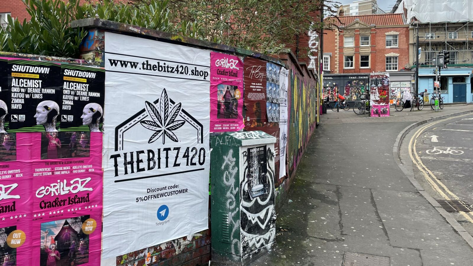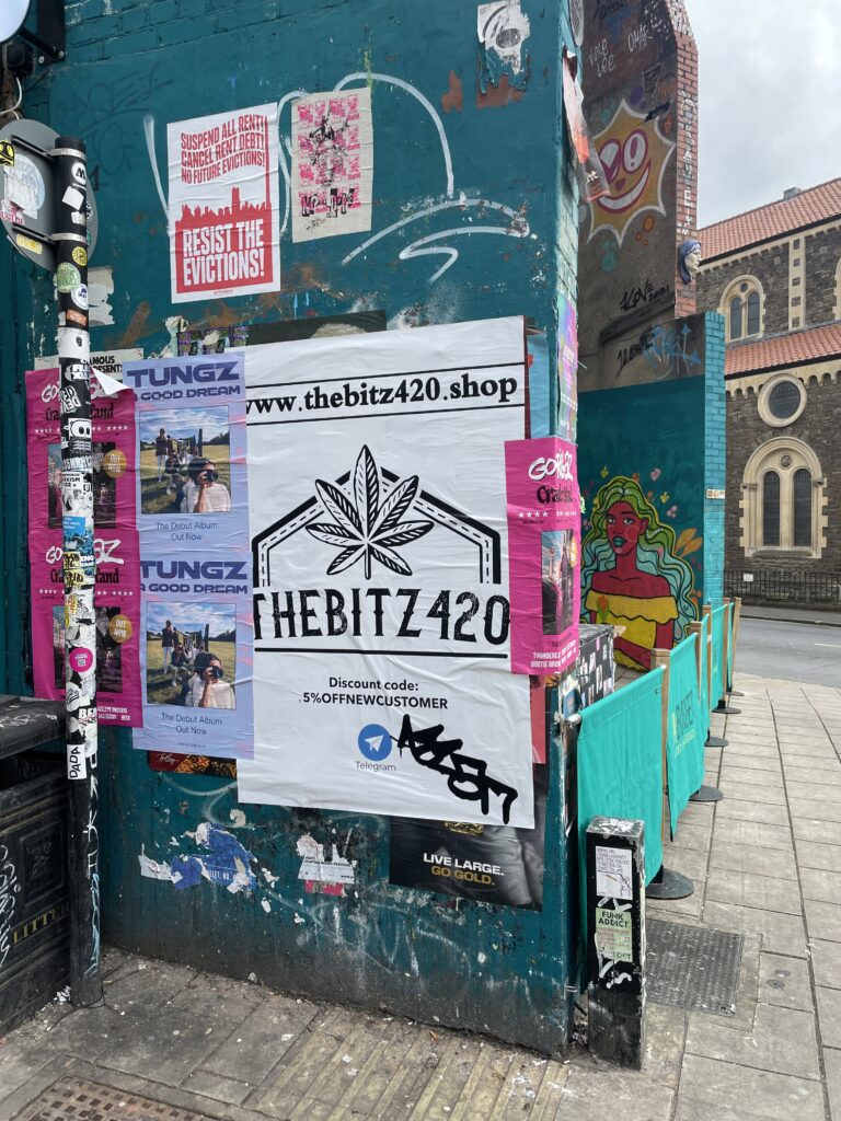 The posters are alongside others for new albums and club nights. These are not for music, however, but for “hassle-free top quality cannabis”.