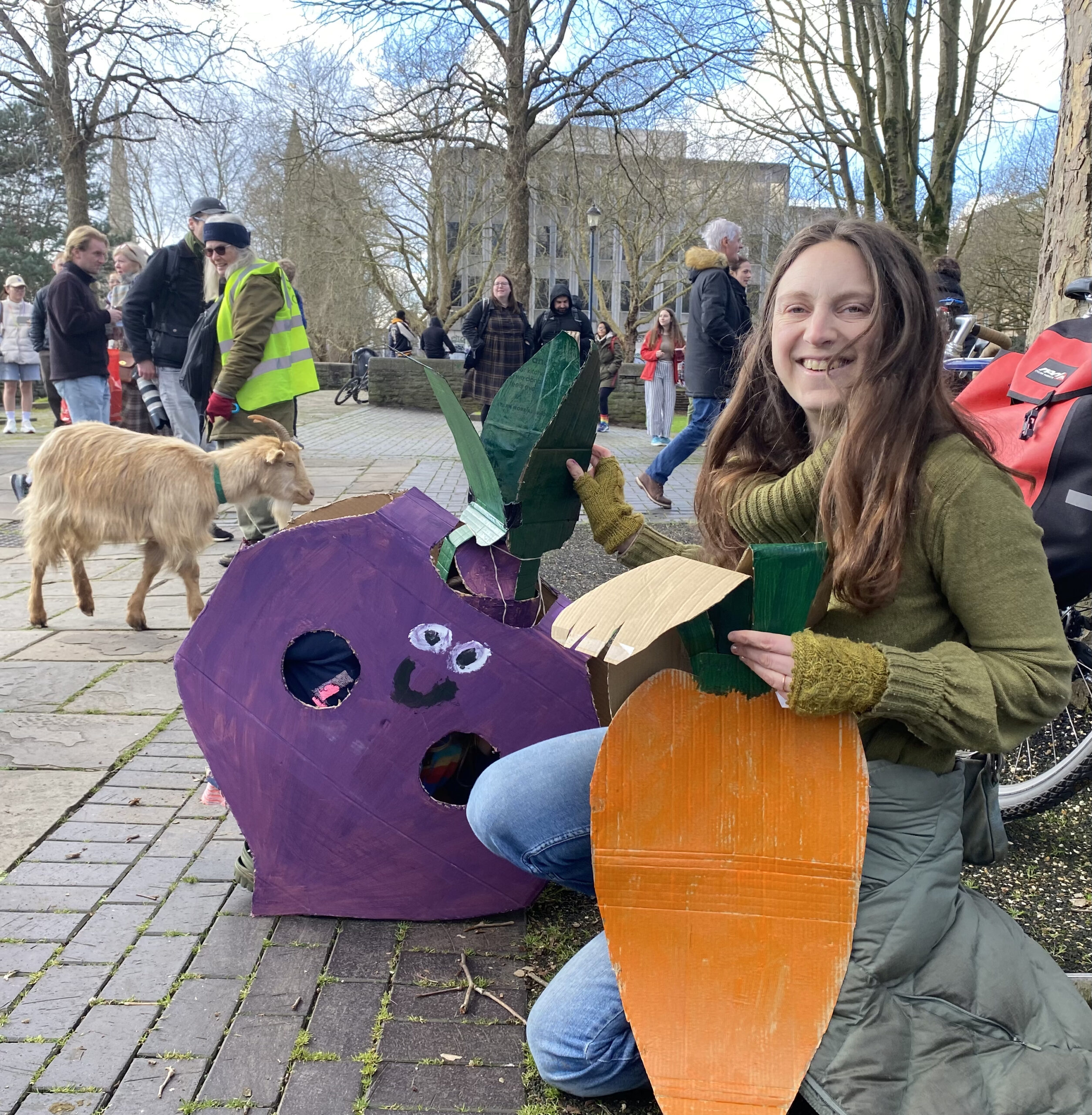 One protester was dressed as a turnip with others wearing flower headdresses as they paraded from Castle Park to College Green.