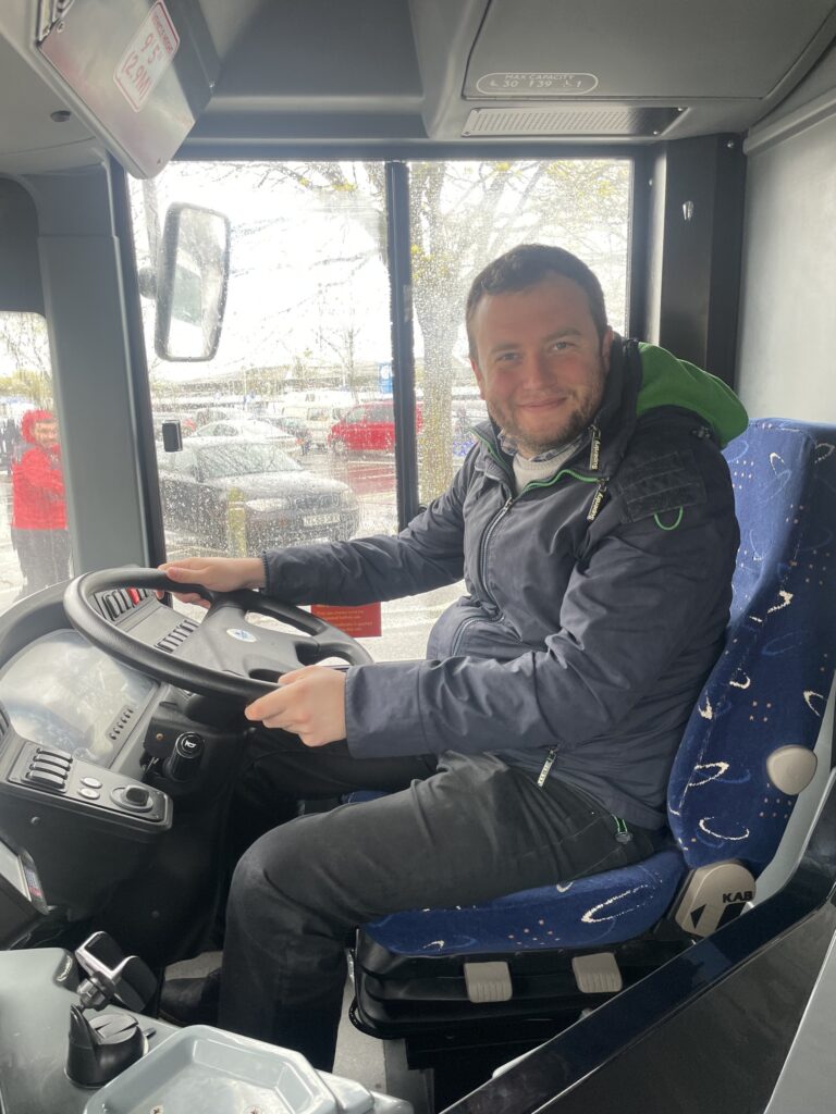 Bristol’s Labour group leader Tom Renhard pretending to drive a bus – photo: Tom Renhard