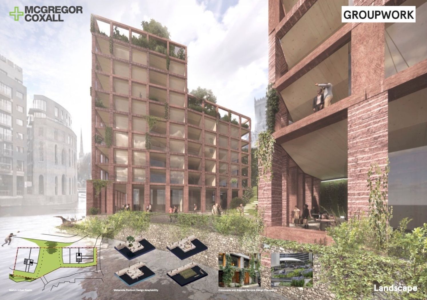 Groupwork and McGregor Coxall: “The site presents both historical and contemporary context – industry to leisure, defence to parkland, trade to waterside. We propose to strengthen the connection between these pairings in a strong architectural order built from structural stone and timber, broken down in scale and made permeable by landscaped gardens from roof to waterside referencing the site’s past and enabling its future. Two blocks are split to introduce a colonnaded ‘street’ connecting harbourside and gardens and a gradual stepping away of massing from the waterside to reinforce a scale of private to public frontage. A structural limestone exoskeleton defines the site’s boundary, toothed into the existing water’s edge to reference Bristol Castle’s historic defensive limestone walls, a modern design born from antiquity. The materials are traditional yet speak of contemporary innovation, alluding to the pioneering heritage of Bristol and the site’s original material history. We propose this is the next step in Bristol’s legacy of innovation.” – image: Groupwork and McGregor Coxall