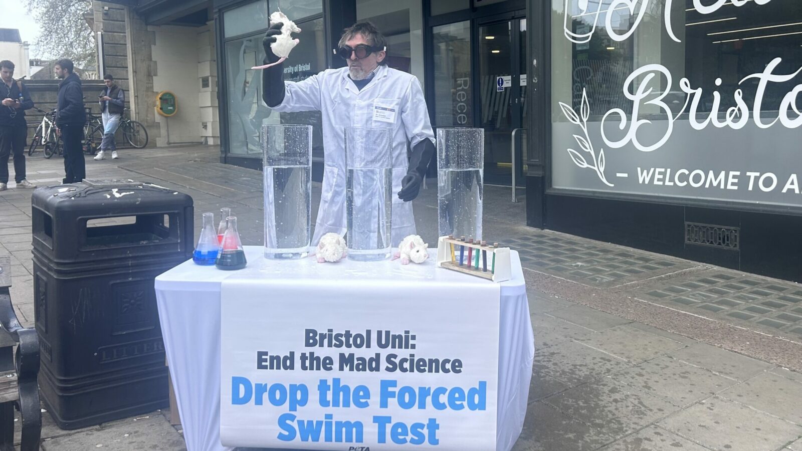A PETA activist dressed as a “mad scientist” held a protest outside a University of Bristol building on Wednesday against the institution’s use of rats and mice in forced swim tests.