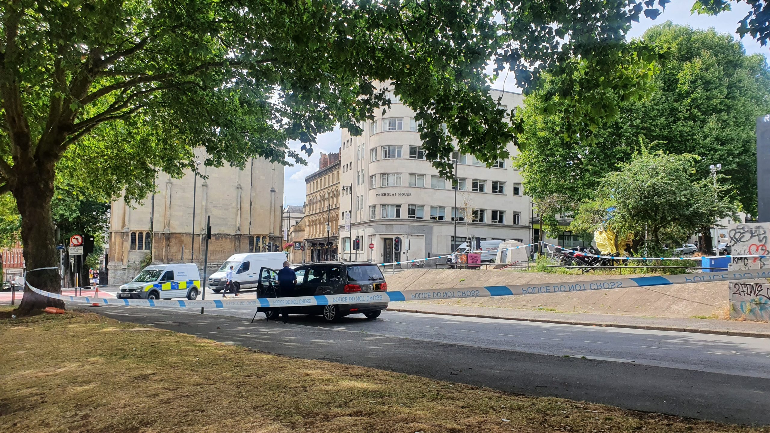 A section of Castle Park near Bristol Bridge remained cordoned off on Thursday following the incident on Wednesday night. A taxi that appears to have been abandoned is inside the cordon.