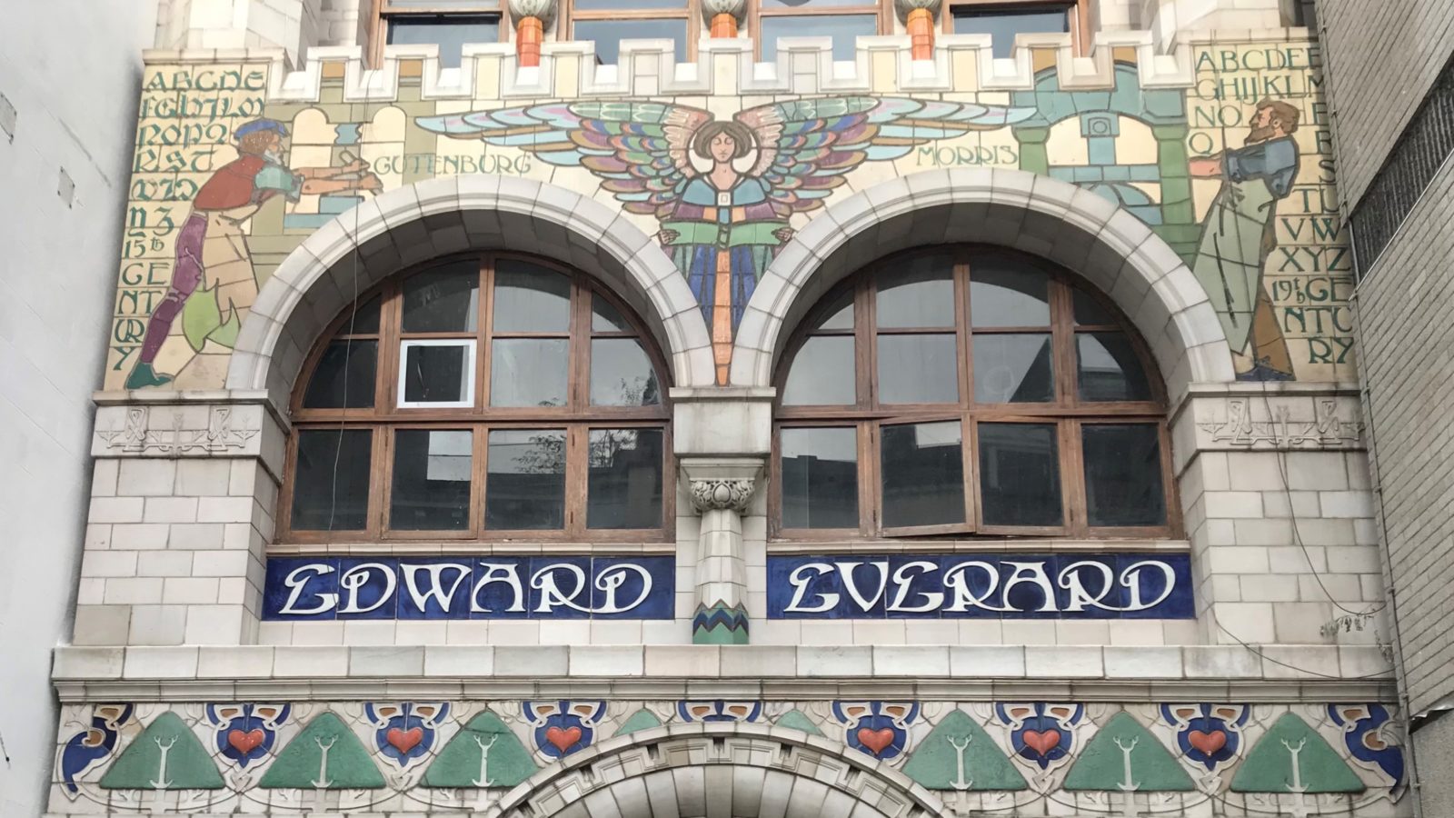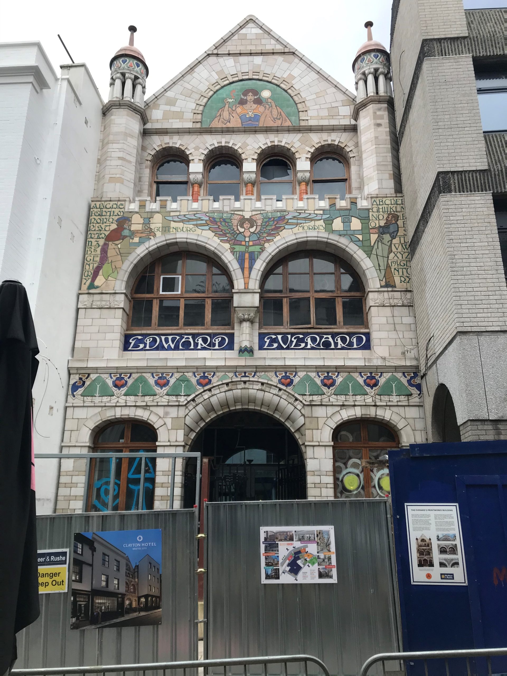 Edward Everard’s Printing Works features an Art Nouveau tiled façade set back from its neighbours on historic Broad Street, with scaffolding recently removed to reveal the restored colours from 1900.