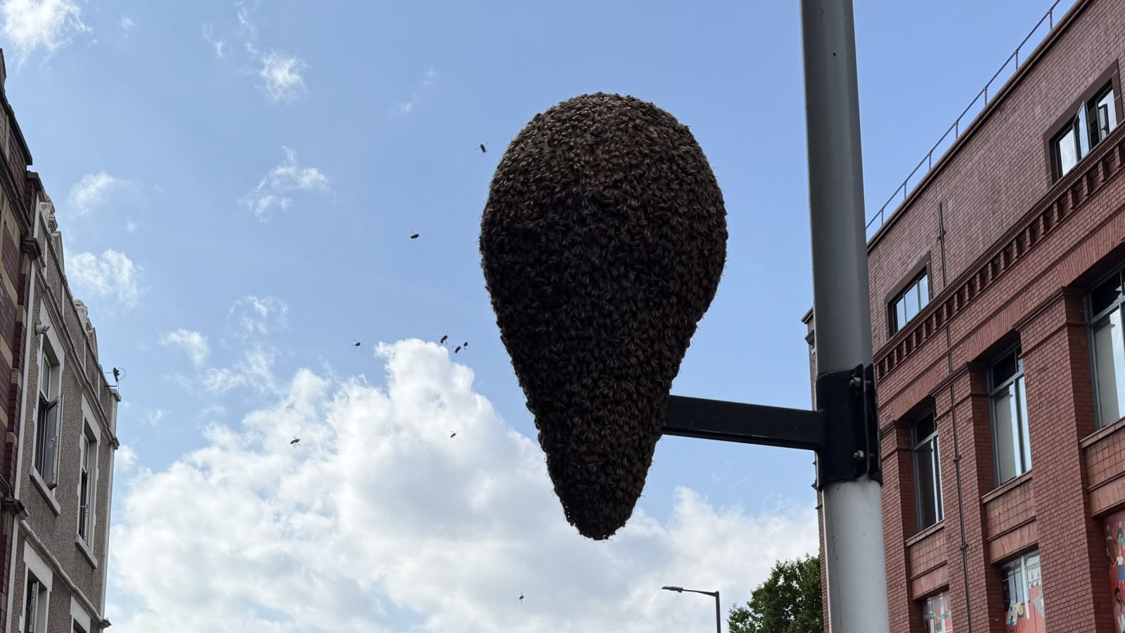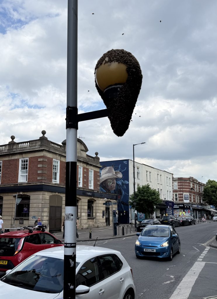 The latest bee swarm saw the buzzing honey makers take over a Belisha beacon opposite the Tobacco Factory, which has a hive on its roof.