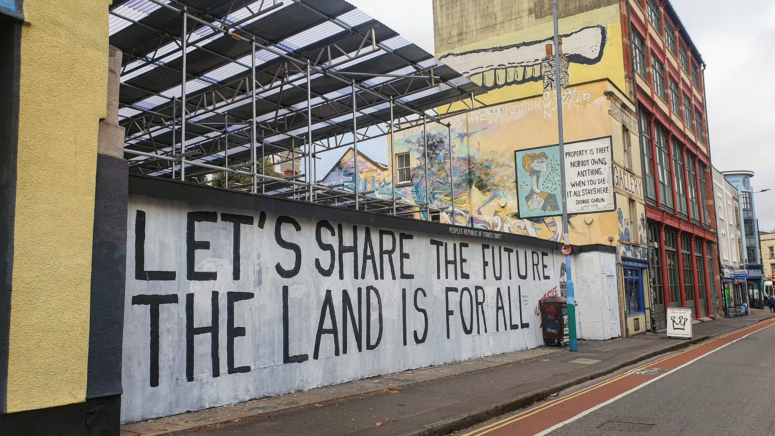 ‘Let’s share the future, the land is for all’ is currently written across the ever-changing outdoor canvas on Jamaica Street.